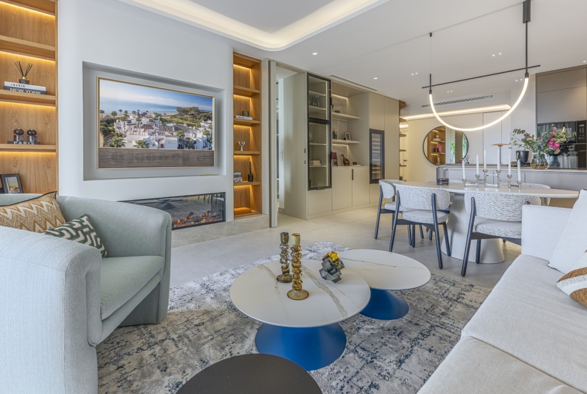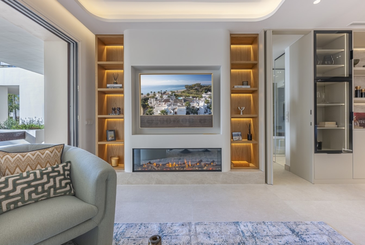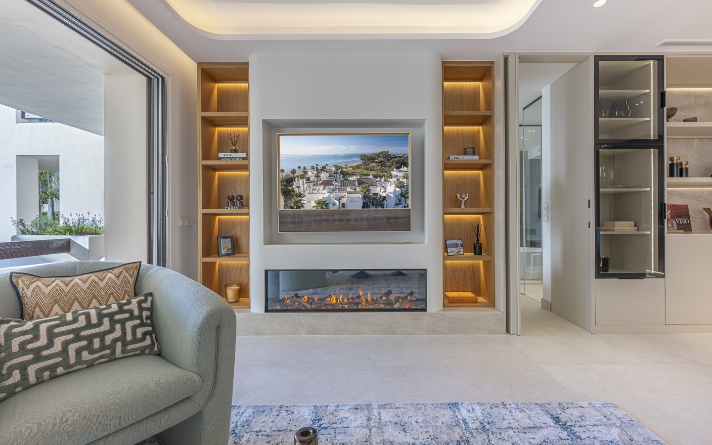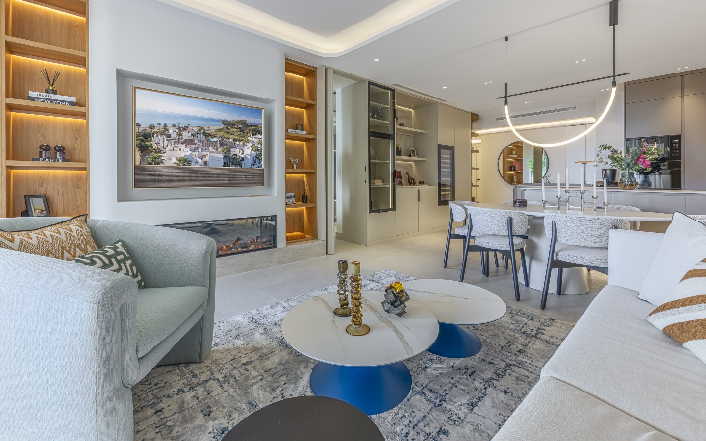 The apartment is enhanced by a range of luxurious features, including an open-plan designer kitchen fitted with premium German appliances, high-quality flooring, elegant contemporary furnishings, an electric fireplace, a Bang & Olufsen sound system, and bespoke built-in wardrobes.