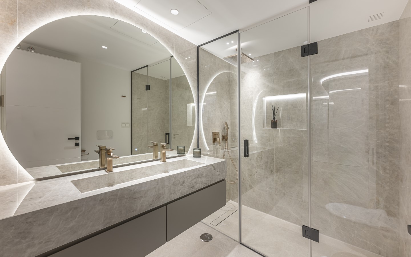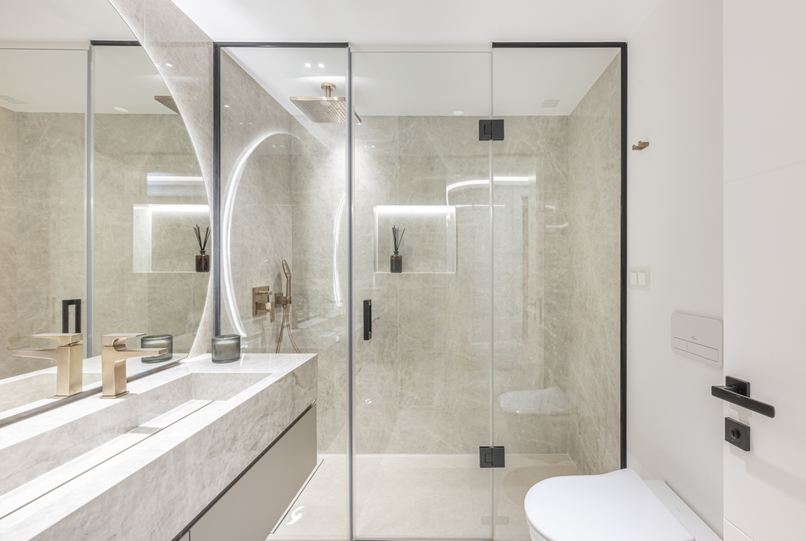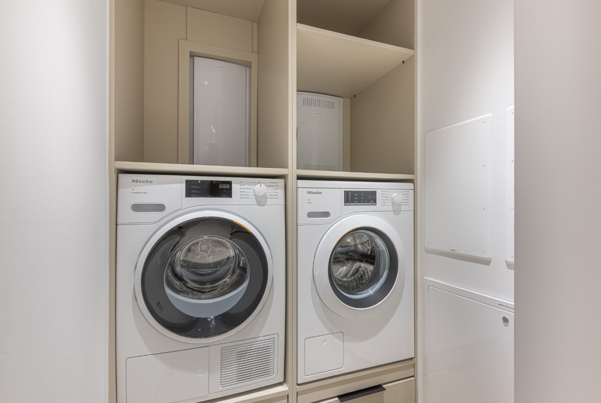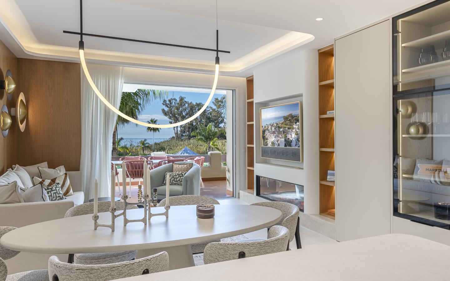 The apartment is enhanced by a range of luxurious features, including an open-plan designer kitchen fitted with premium German appliances, high-quality flooring, elegant contemporary furnishings, an electric fireplace, a Bang & Olufsen sound system, and bespoke built-in wardrobes.
