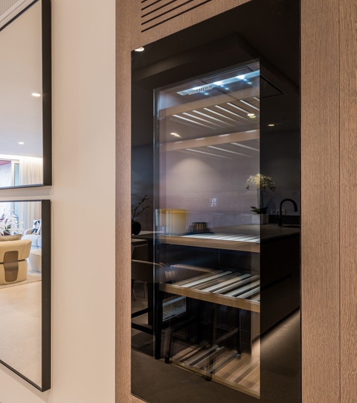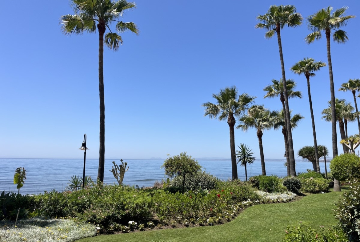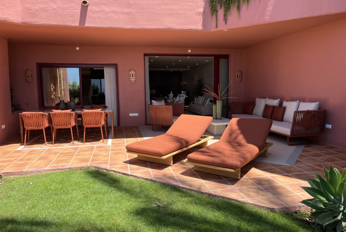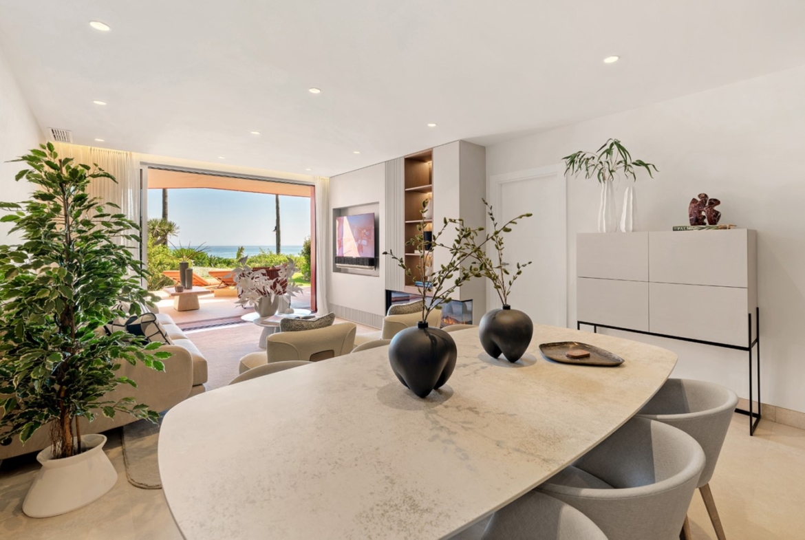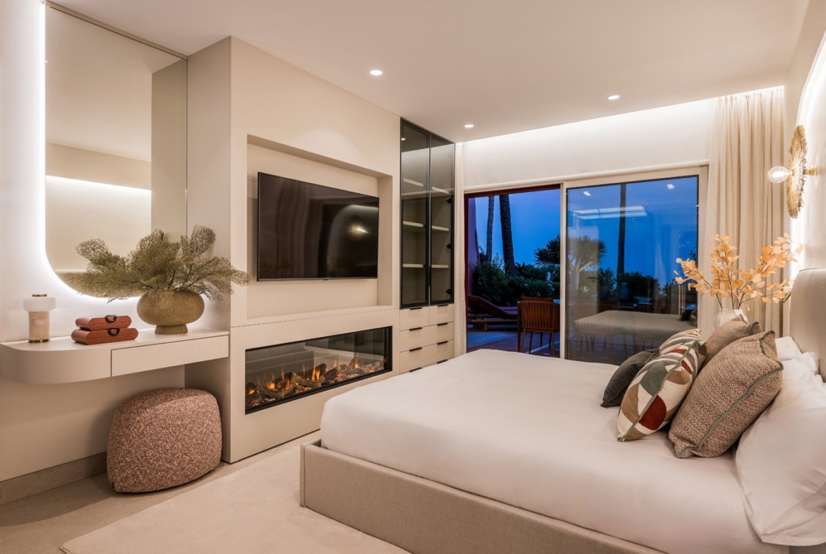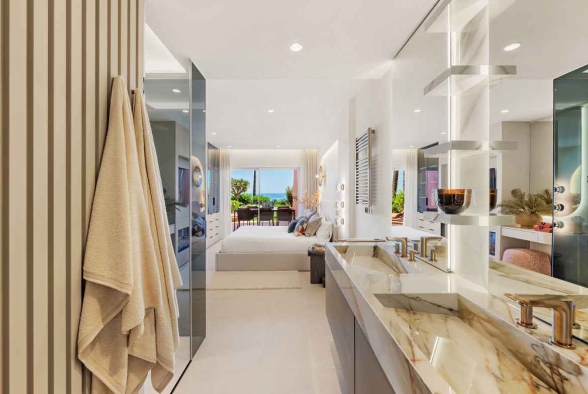 Menara Beach is a luxury beachfront community on the New Golden Mile, located between Marbella and Estepona. Designed by Melvin Villaroel, it features tropical gardens, two outdoor pools, a heated indoor pool, gym, sauna, and 24-hour security. With direct beach access and top amenities, Menara Beach offers an exceptional coastal lifestyle. Discover this stunning, newly renovated three-bedroom, two-bathroom beachfront apartment located within a prestigious gated community on the New Golden Mile. This breathtaking ground-floor residence offers the perfect beachfront living experience, with direct access to the beach, a stunning private terrace, and unparalleled views of the sea. The apartment offers a refined blend of comfort and style with a premium B&O sound system, a gourmet kitchen equipped with an invisible hob, wine fridge and Thermomix appliance, as well as a cozy electric fireplace. The design also includes a spacious walk-in closet and a cleverly concealed laundry area, ensuring both functionality and sleek aesthetics for an unparalleled coastal living experience