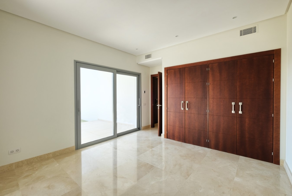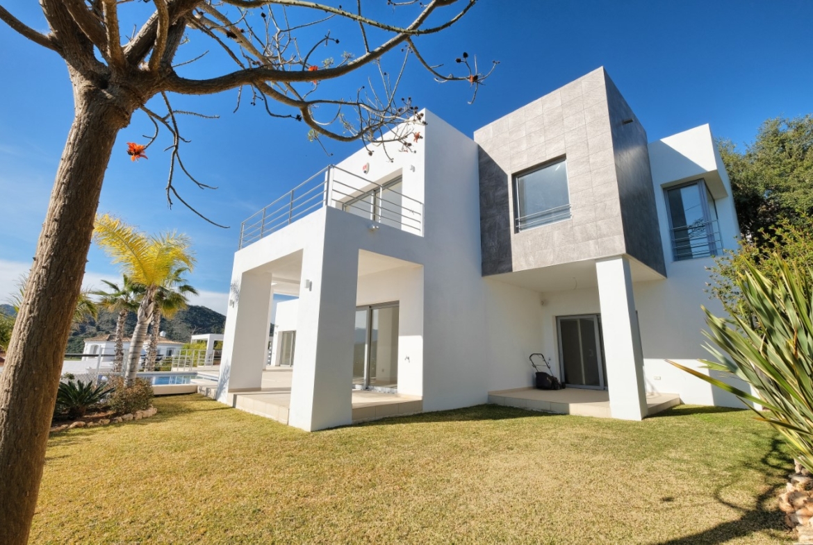 New built contemporary villa with four bedrooms in Puerto del Capitan, Benahavis. South to west facing. Sea & mountain views. Main floor: Living and dining area with high ceilings and fireplace and direct access to the garden and pool area. Fully fitted kitchen with Bosch appliances. Two guest bedrooms sharing one bathroom. Guest toilet. First floor: Master bedroom en suite with dressing room, one guest bedroom en suite. Roof terrace. Basement: Laundry area and storage. Gated community. Close to all amenities, less then 10 minutes to the beach, Puerto Banús and San Pedro village.