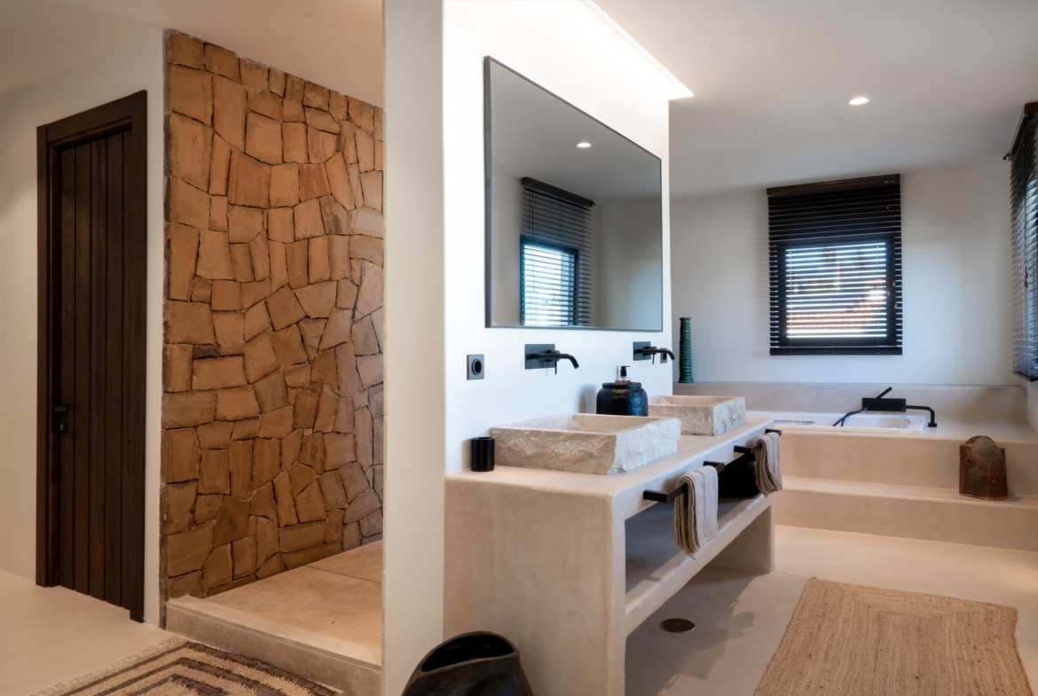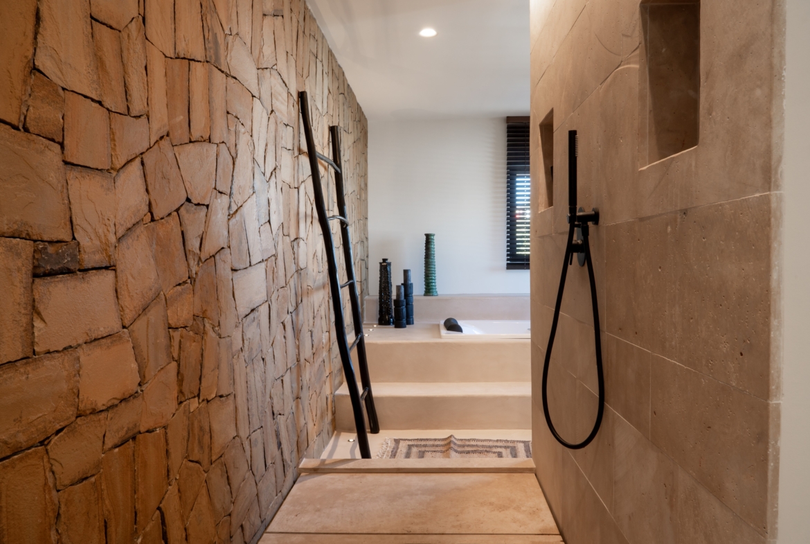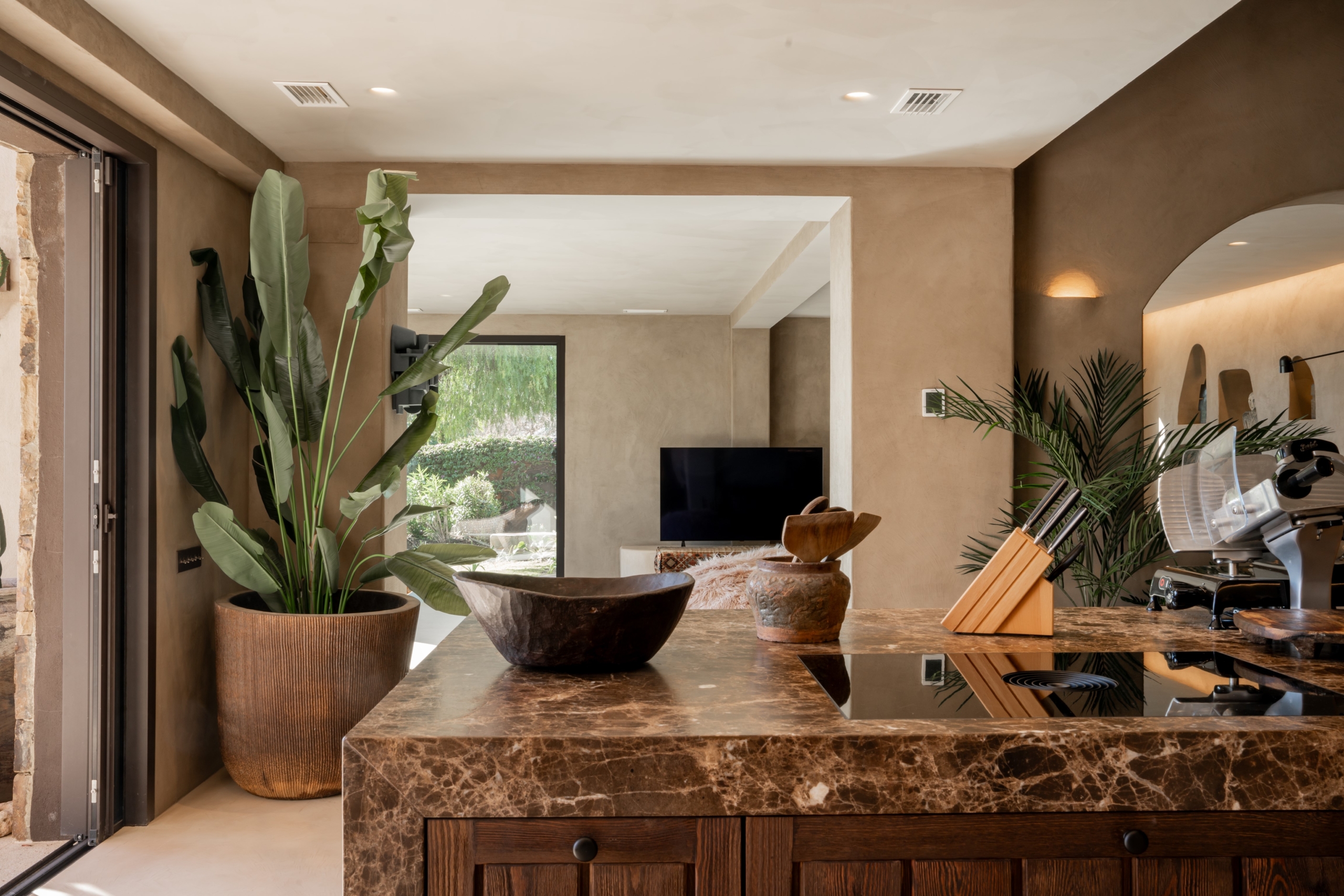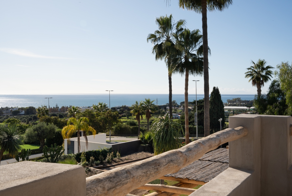 A truly unique property, fully renovated in 2024, blending inspirations from Mexico, Thailand, Ibiza, and Andalusia. Situated in the emerging area of Selwo, this villa offers stunning sea views from the garden and swimming pool level. This exceptional home features 5 spacious bedroom en suites spread over two levels, a cozy living room with a working fireplace, and a spectacular open-plan kitchen with dining area, storage, and a guest cloakroom. The exterior boasts a shower room for the heated infinity pool and a carport for two cars. Primarily south-facing, the property is surrounded by a beautifully landscaped garden with various seating areas, a pétanque court, and an exotic pergola with a lounge corner perfect for relaxation. The main terrace includes an Argentinian barbecue and an elegant wooden table for al-fresco dining. The master suite occupies the entire upper floor and features a private open terrace with sun lounger, an outside shower and the suite offers a spectacular dressing room and complete bathroom with bath and shower. The villa’s unique design incorporates polished concrete floors throughout, underfloor heating in all bathrooms, additional wall insulation, and individual air conditioning units for both heating and cooling, as well as ceiling fans. Sustainability is a priority, with 24 solar panels installed to supply hot water and heat the swimming pool. Located less than 1 km from the beach, the property is within walking distance of three restaurants, the beach, a new padel tennis club, and a short drive to Estepona (10 minutes), Puerto Banús (10 minutes), and Malaga Airport (45 minutes). This architectonic masterpiece, both in the house and garden, is truly incomparable on the coast.