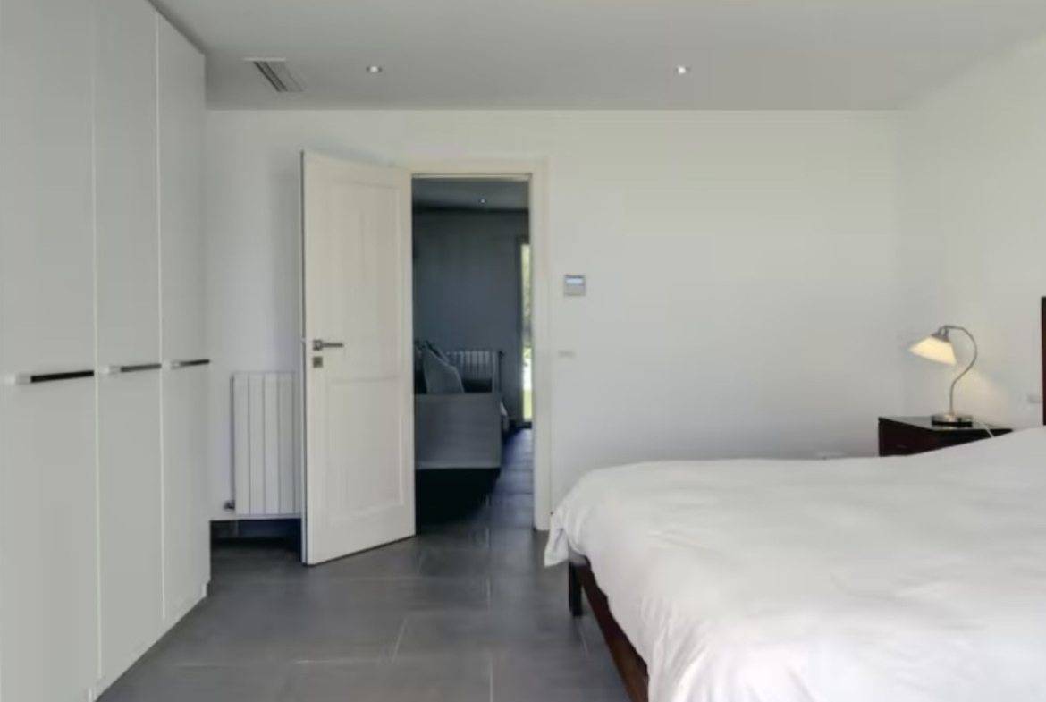 Main floor: Entrance hallway with dressing and guest toilet, living and dining area, fully fitted top quality kitchen, laundry area, two guest bedrooms en suite. Direct access to the closed and open terraces, the garden and the pool.