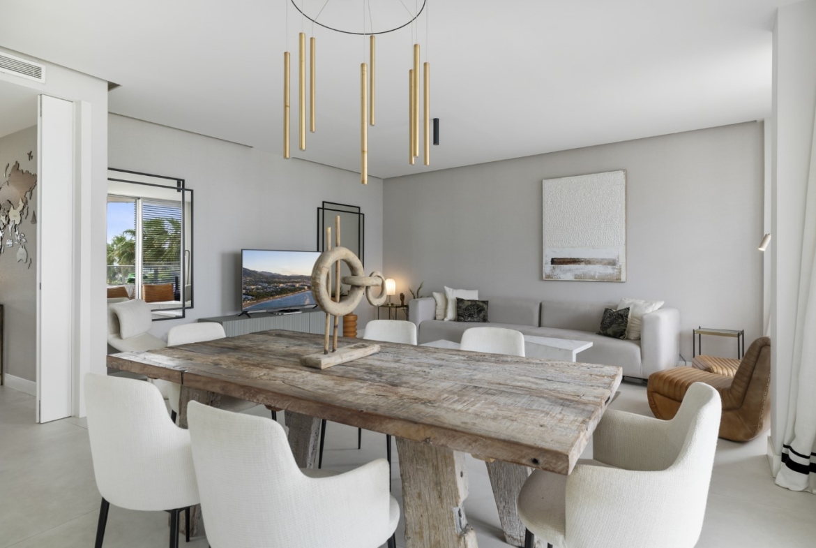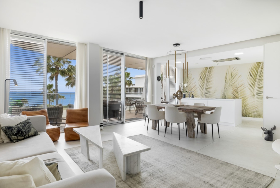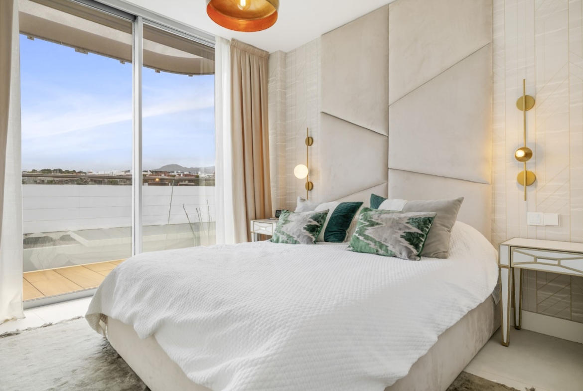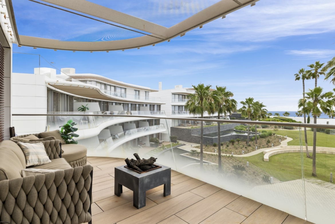Welcome to one of the finest luxury residences on the New Golden Mile — a stunning 3-bedroom apartment located in the exclusive beachfront urbanisation The Edge, just west of Estepona. This secondu0002floor home combines elegant contemporary design with an unbeatable location, offering panoramic views of the Mediterranean and first-class amenities. Just steps from the beach and within walking distance to local shops and restaurants, the apartment is also only a 5–10 minute drive to the vibrant Estepona port and charming town centre. The spacious living and dining area is bathed in natural light and seamlessly connected to a sleek, fully fitted open-plan kitchen. The master suite features a private dressing area and en-suite bathroom, while two guest bedrooms share a stylish bathroom. There is also a guest toilet for added convenience. Step out onto the covered front terrace and enjoy tranquil views of the beautifully landscaped gardens, infinity-edge communal pool, and the sparkling sea beyond. A second, southwest-facing rear terrace invites you to relax in the warm glow of the evening sun.Additional features include underground parking, a private storage room, and access to exceptional on-site facilities: