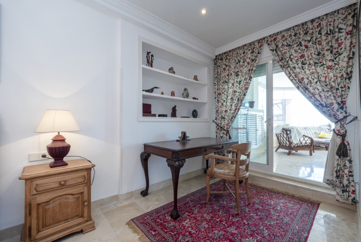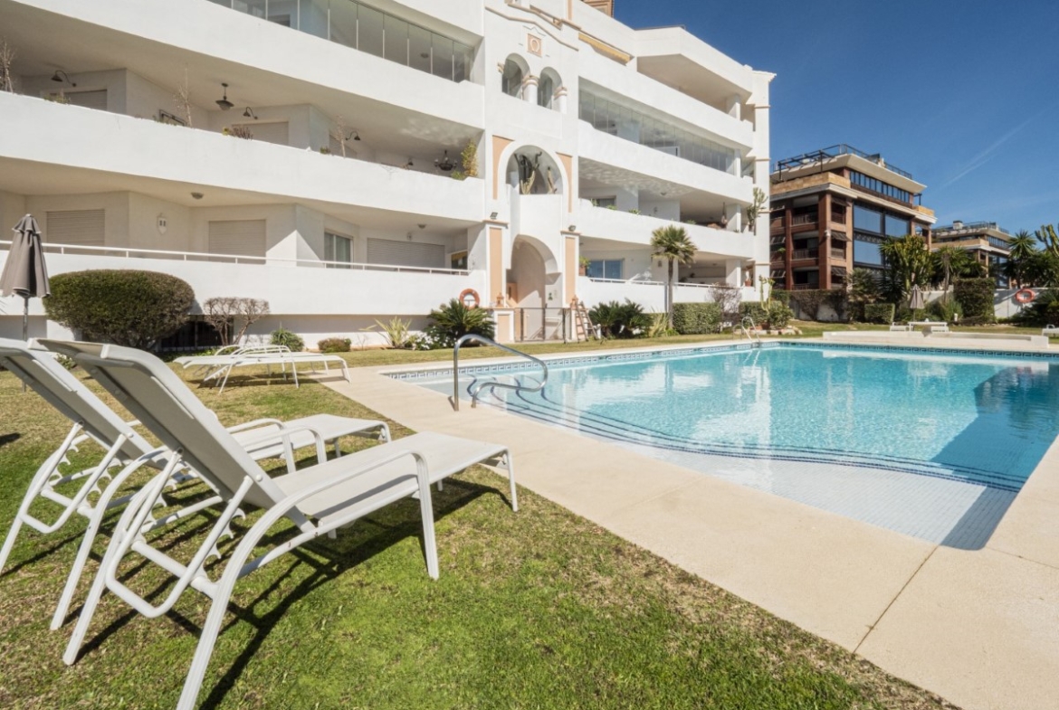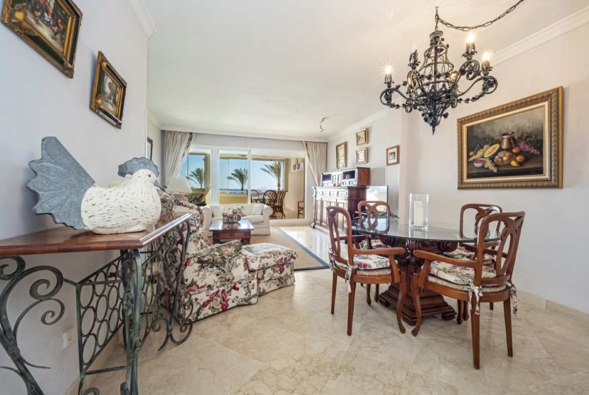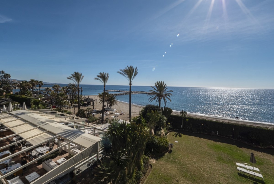Front line beach apartment in La Herradura, Puerto Banus, Marbella. The apartment is located on the second floor of the buidling and facing south to east. Direct views to the beach and the sea, also walking distance to famous Puerto Banus. The apartment offers a large living and dining area, a fitted kitchen, a spacious master bedroom ensuite, one guest bedroom and one bathroom. The covered terrace is with glass curtains. Included are one garage space and a storage room.. Community pool and gardens, as well direct access to the beach.