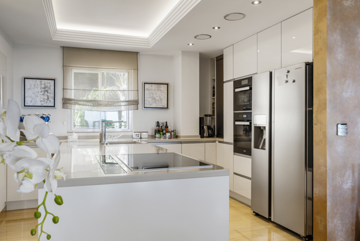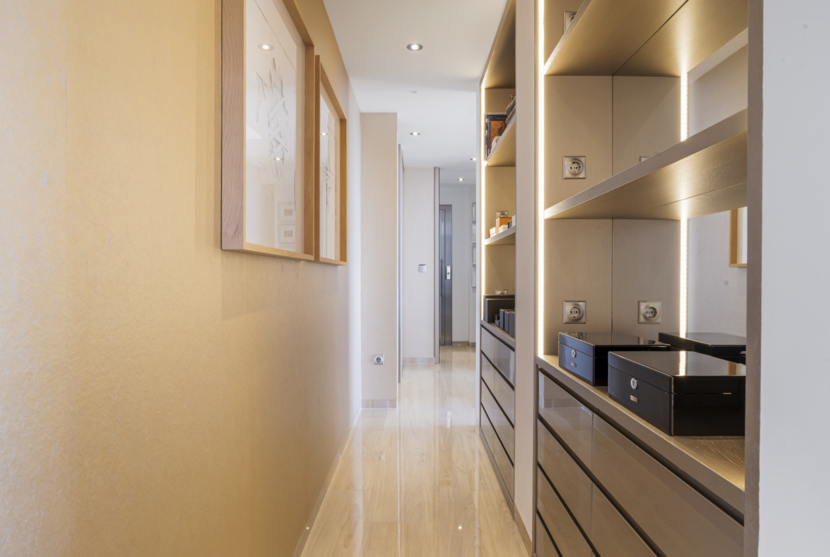 The upper floor is dedicated to the impressive master suite featuring his-and-hers bathrooms, a large dressing area and direct access to a private terrace, together with a further guest bedroom en suite. Above, the solarium has been designed for ultimate relaxation and wellness, offering a gym, sauna, steam room, jacuzzi and a stylish chill-out area. Additional features include air conditioning with heating, underfloor heating throughout, domotica system, garage parking for 2 cars and a storage room.