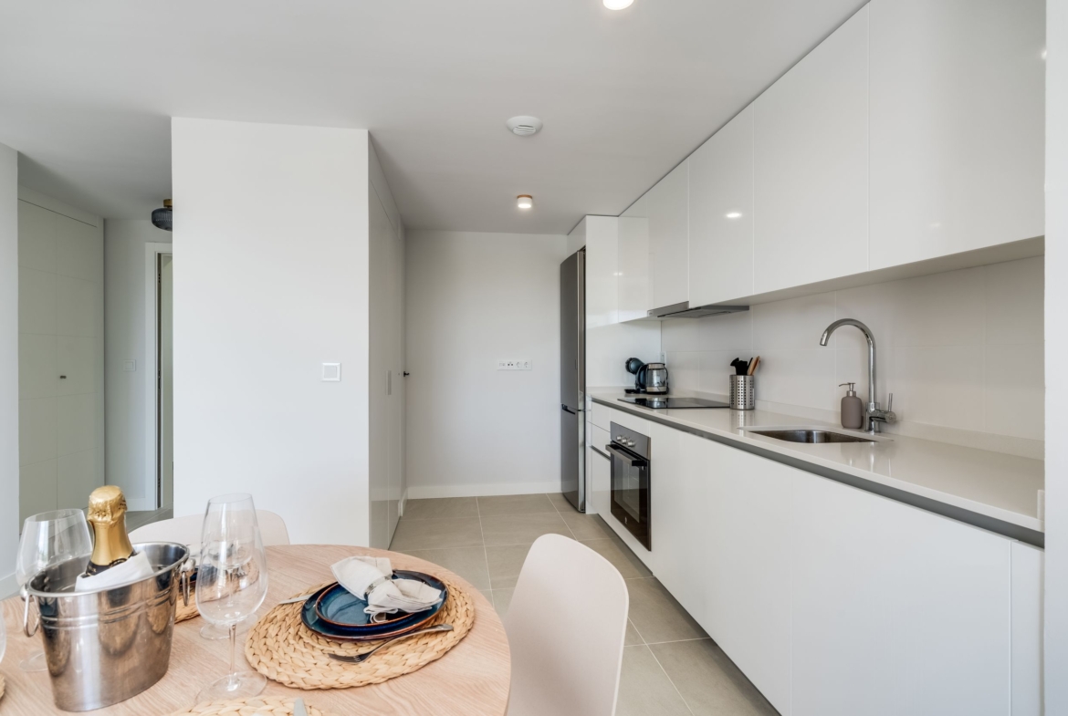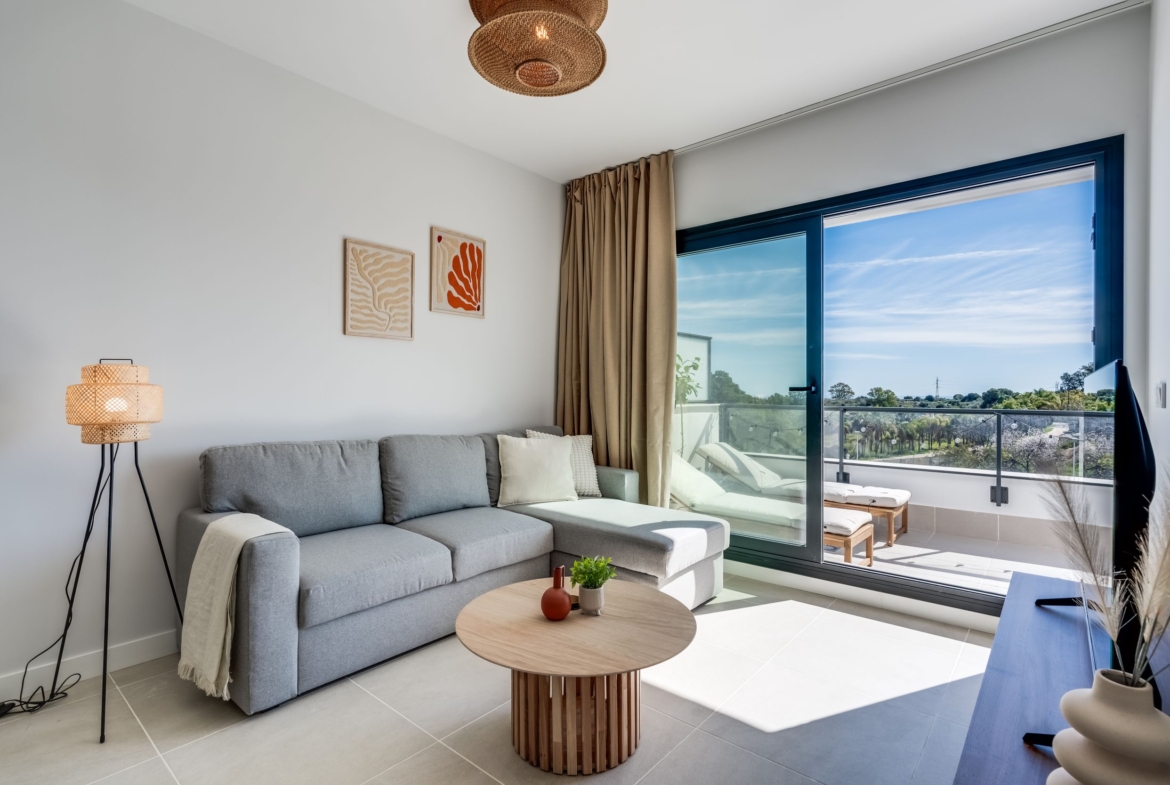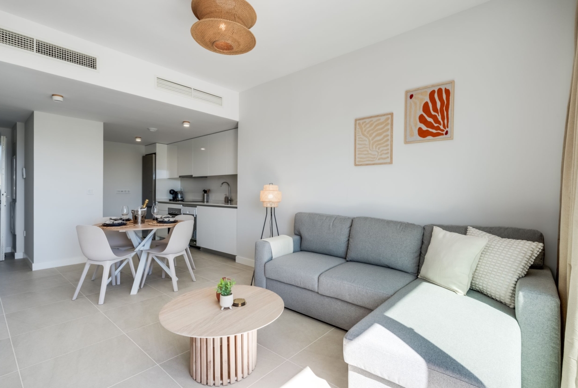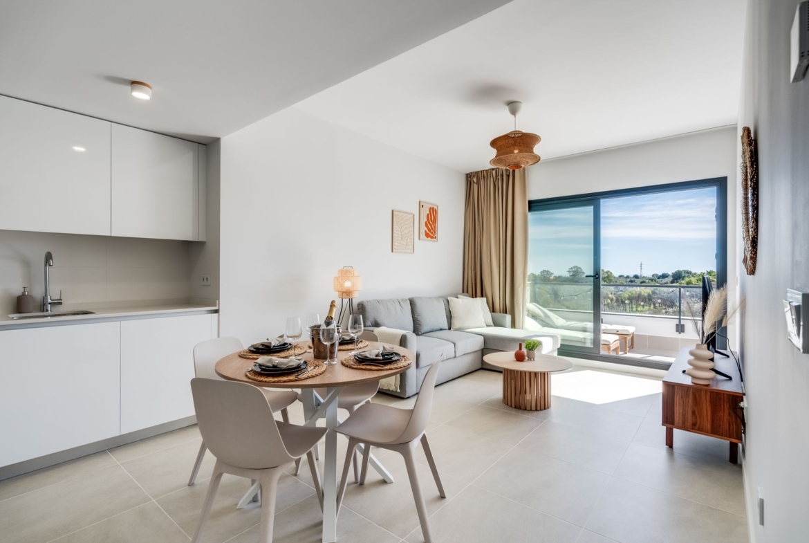 Contemporary one-bedroom apartment located in the Aranya residential complex, built in 2023, in Selwo, Las Joyas. Southwest facing, offering plenty of natural light and a comfortable modern layout. The property features a living and dining area with an open-plan fully fitted kitchen with Bosch appliances, one bedroom en suite, and direct access to a spacious terrace.