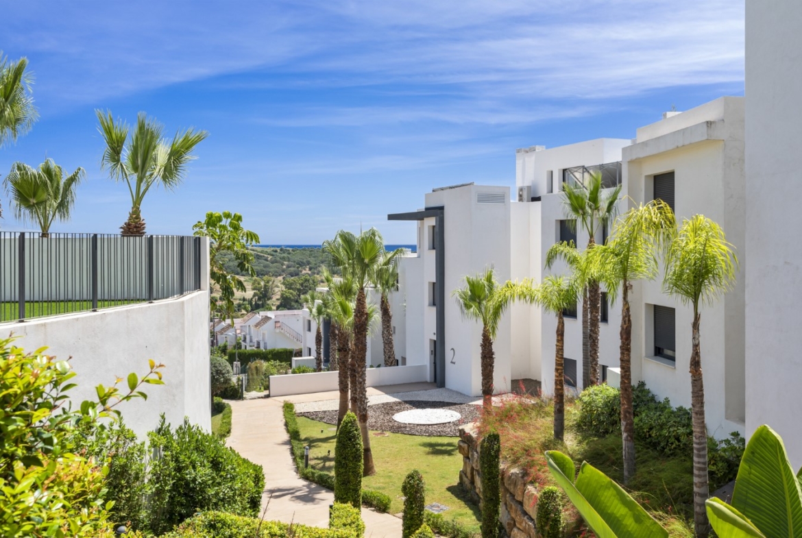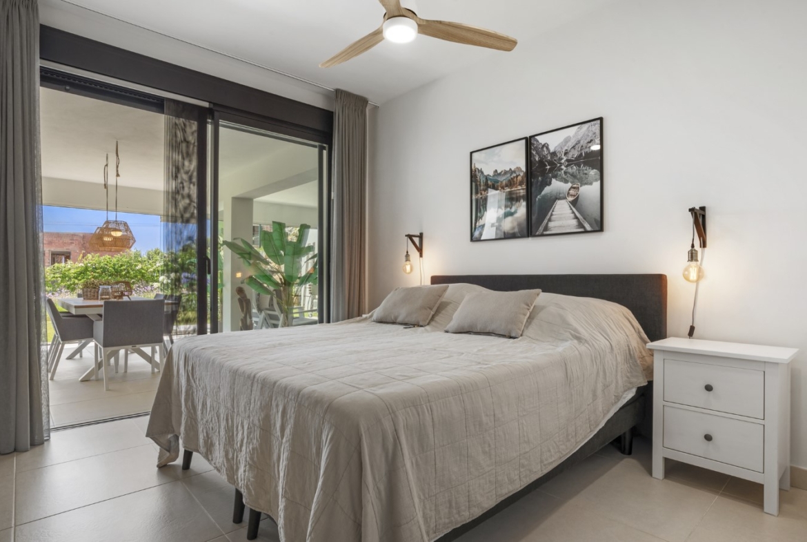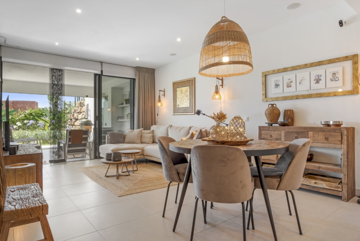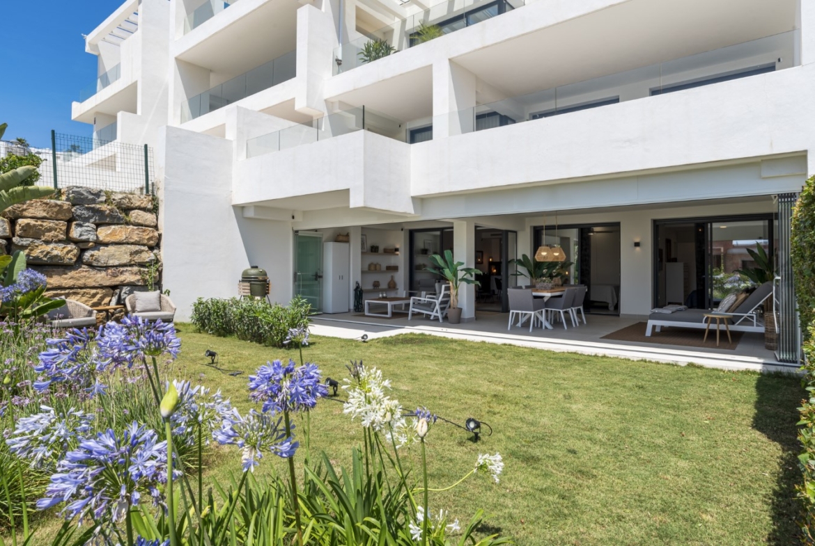 Beautiful and contemporary 2-bedroom ground-floor apartment located in the sought-after Mirador del Golf development, next to Estepona Golf Club. Built in 2021, this property combines modern design, comfort, and privacy in a peaceful setting just minutes from Estepona town, the beach, and all amenities. The apartment enjoys a southwest orientation, offering sunshine throughout the day and pleasant views over the lush gardens, the mountains, and a glimpse of the sea. The interior features a bright open-plan living and dining area with a fully fitted kitchen with Siemens appliances, creating a seamless flow of space and style. The master bedroom with en-suite bathroom and the guest bedroom with separate bathroom both offer comfort and functionality. From both the living area and master bedroom, you step onto a spacious 54 m² terrace enclosed with glass curtains, allowing you to open it fully in summer or close it to create additional living space in cooler months. The terrace leads directly to a private lush garden of almost 90 m², beautifully maintained by the community — and included in the community fees. Additional features include a private parking space, storage room, a communal swimming pool, well-kept gardens, and a gym. It’s the perfect blend of villa-style living — with space, light, and a private garden — yet with the convenience, security, and easy maintenance of an exclusive gated community. Ideal as a holiday home or permanent residence.