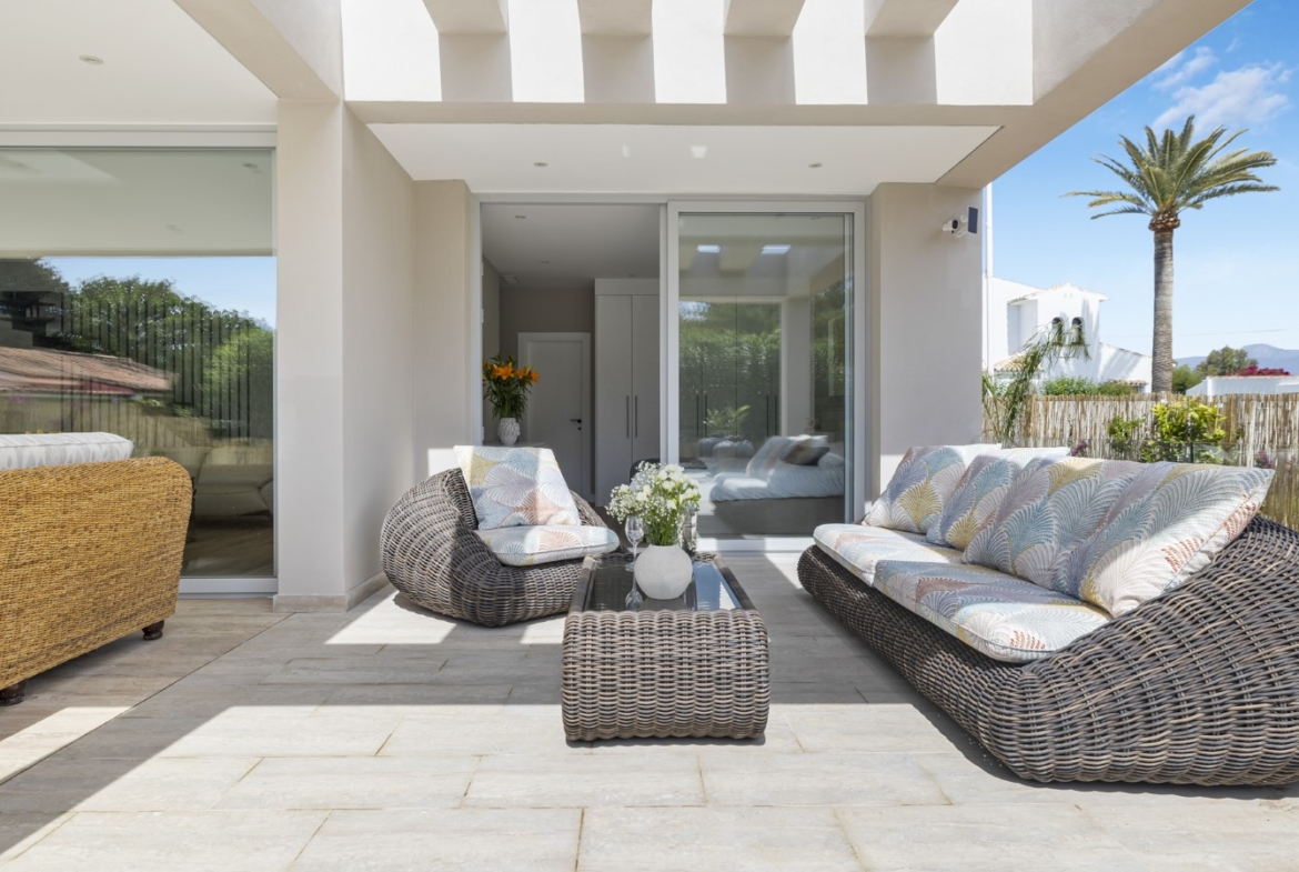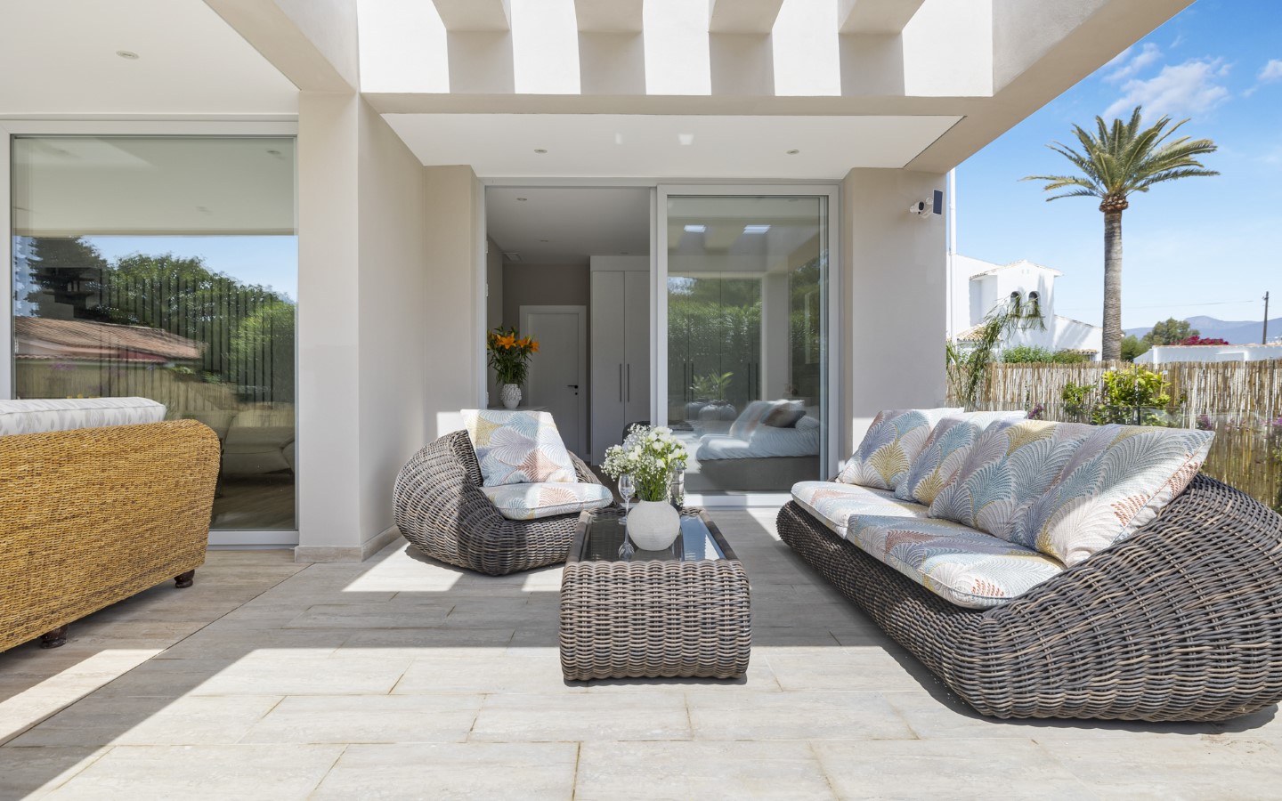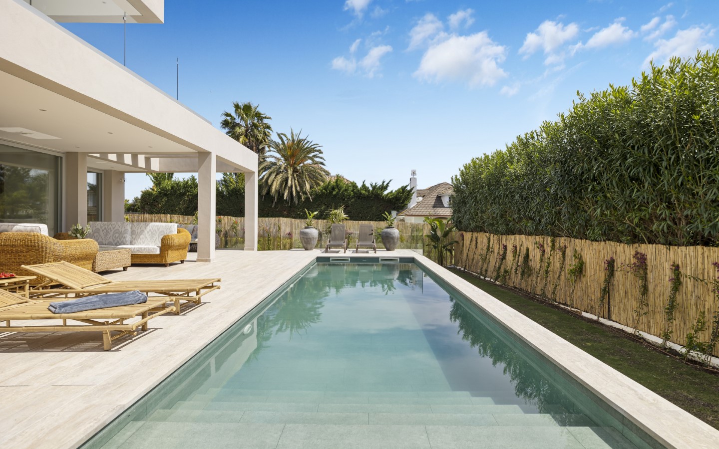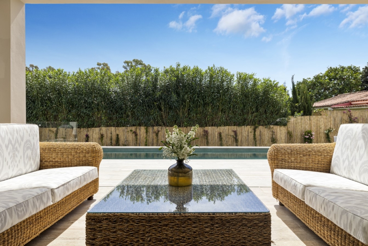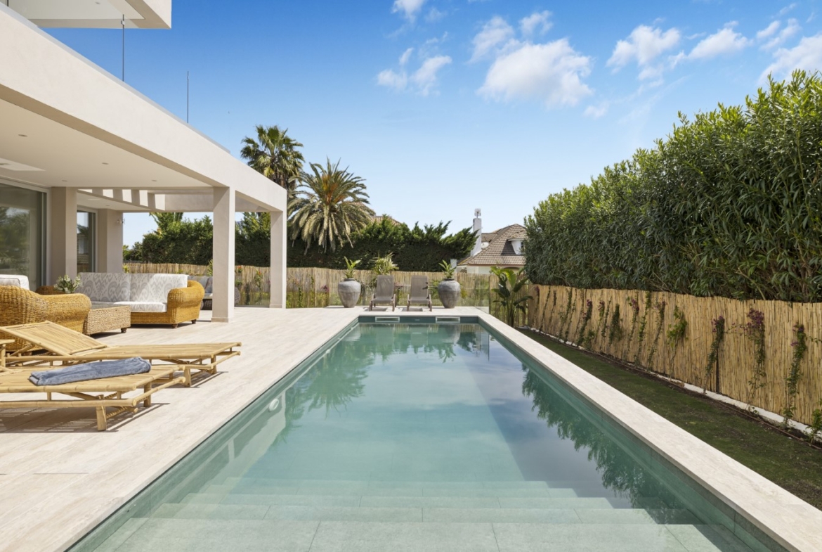 Newly built quality villa on the beach side of San Pedro de Alcántara. Build to the highest German qualities. Walking distance to the beach and the paseo of San Pedro.Main floor: Entrance, living and dining area with an fully open plan kitchen with Bosch appliances, guest toilet, one guest bedroom en suite. Access from all areas to the covered and open terraces and the private pool. First floor: Master bedroom en suite with dressing area and one guest bedroom en suite. Private terraces. Lower floor: A separate apartments with another fully fitted kitchen, one guest bedroom en suite and an entertainment area or gym. Inside parking for two cars. The furniture could be negotiated.A unique location !