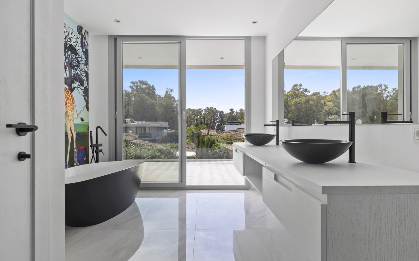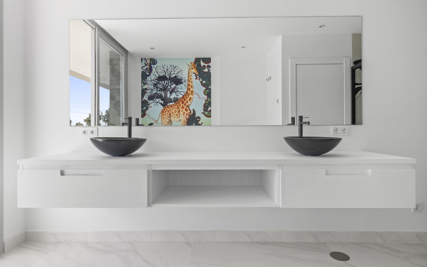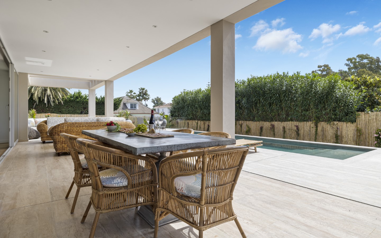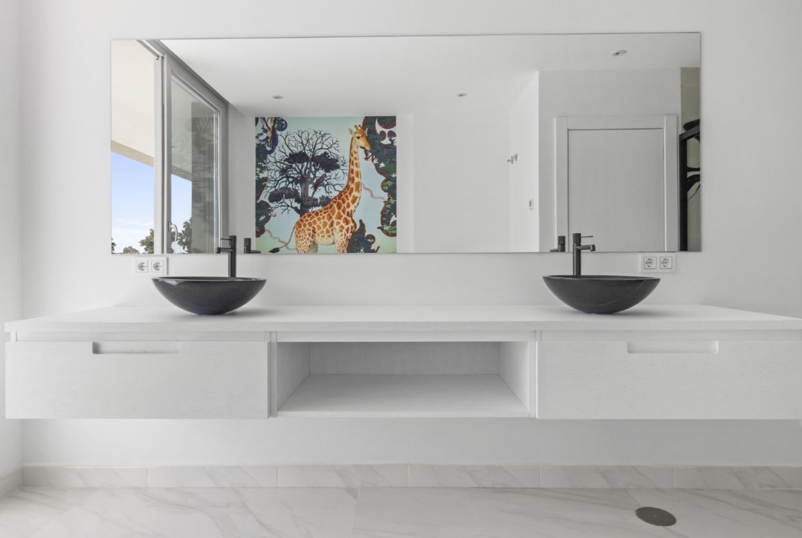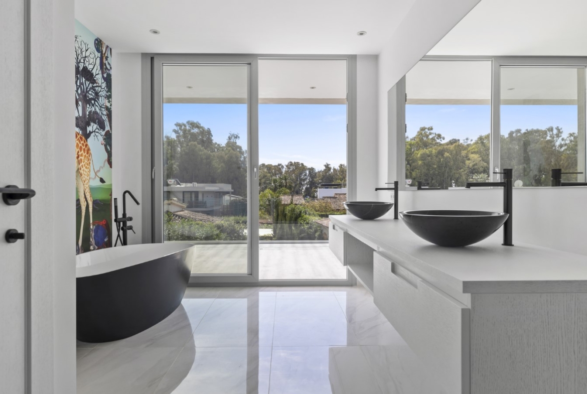 Newly built quality villa on the beach side of San Pedro de Alcántara. Build to the highest German qualities. Walking distance to the beach and the paseo of San Pedro.Main floor: Entrance, living and dining area with an fully open plan kitchen with Bosch appliances, guest toilet, one guest bedroom en suite. Access from all areas to the covered and open terraces and the private pool. First floor: Master bedroom en suite with dressing area and one guest bedroom en suite. Private terraces. Lower floor: A separate apartments with another fully fitted kitchen, one guest bedroom en suite and an entertainment area or gym. Inside parking for two cars. The furniture could be negotiated.A unique location !