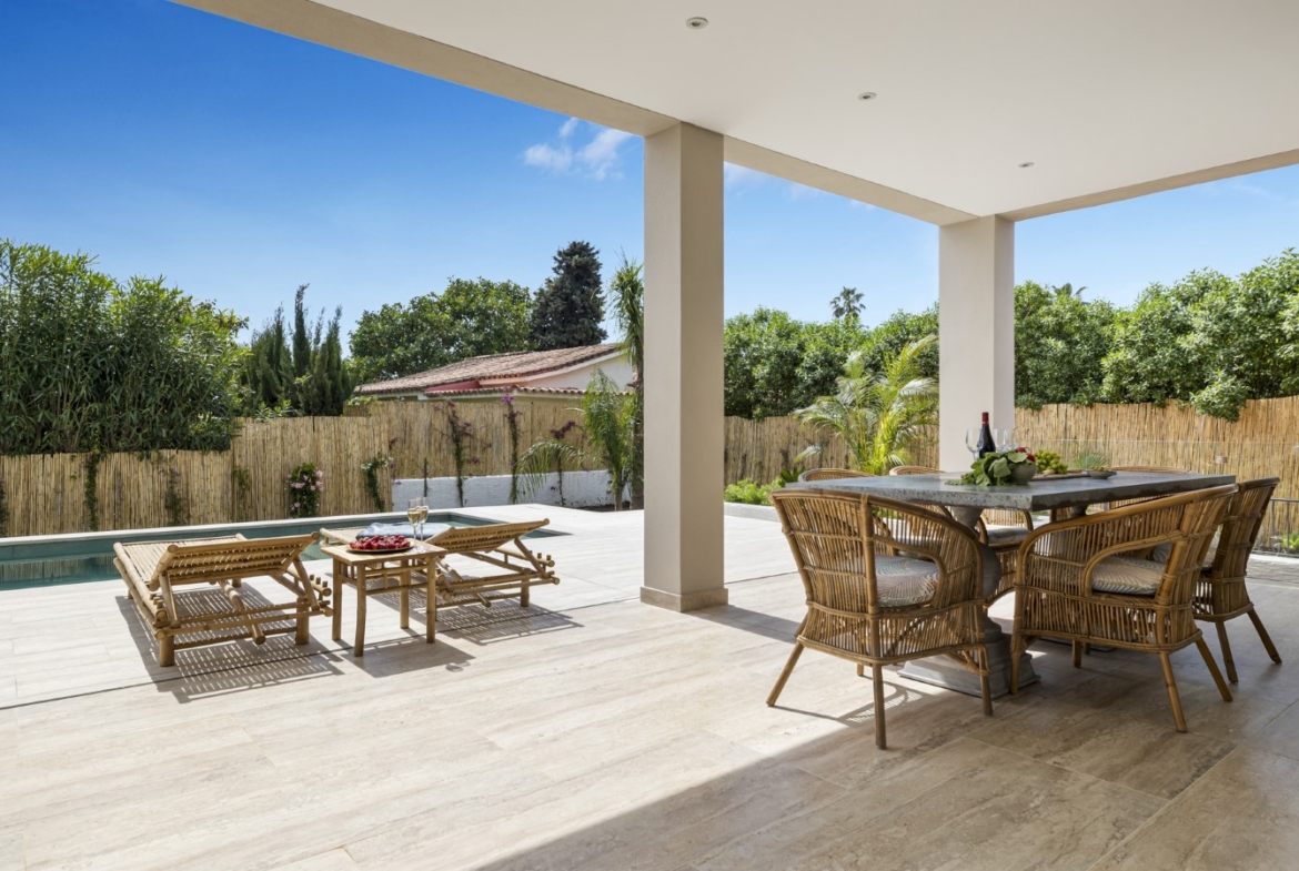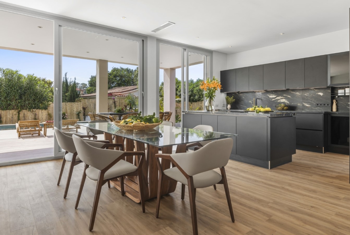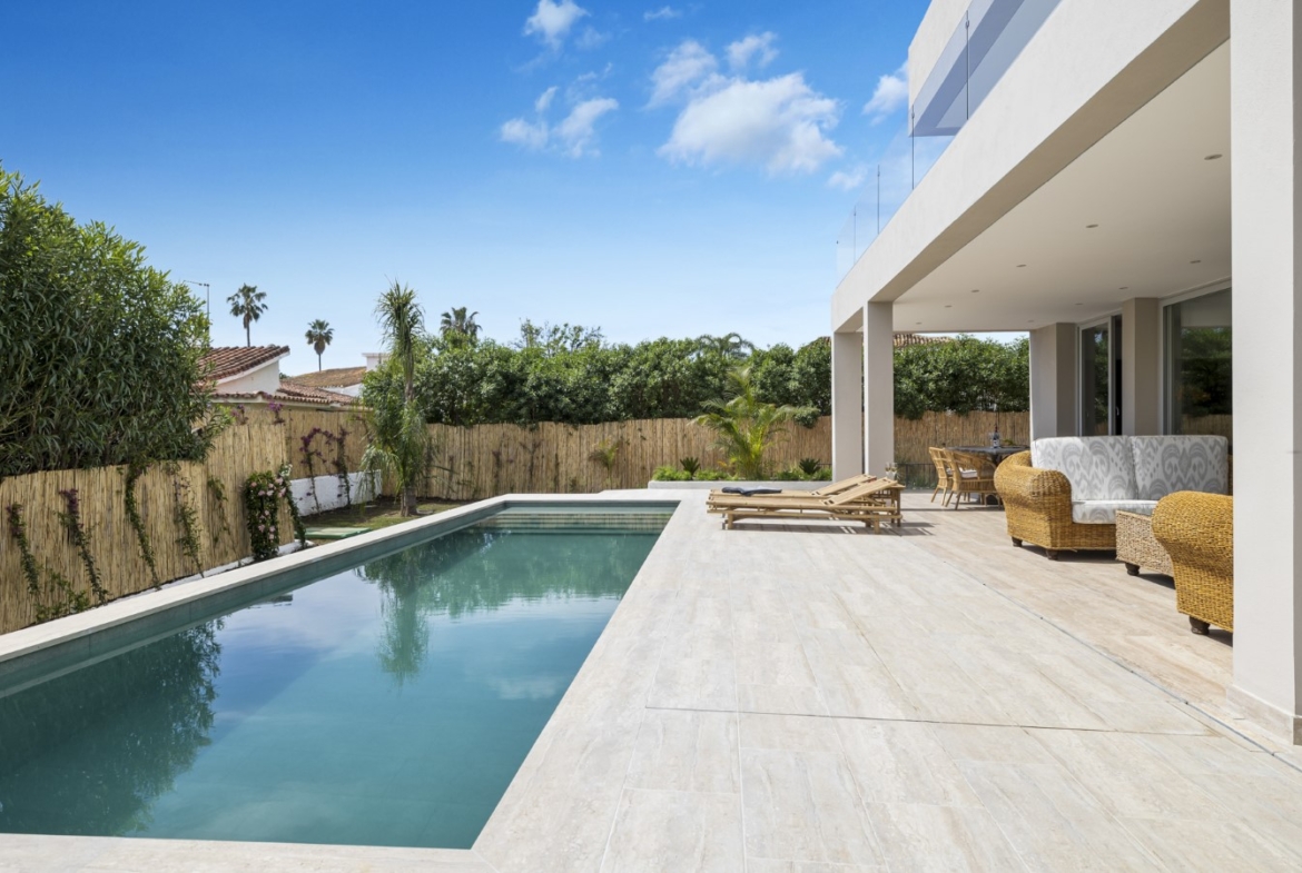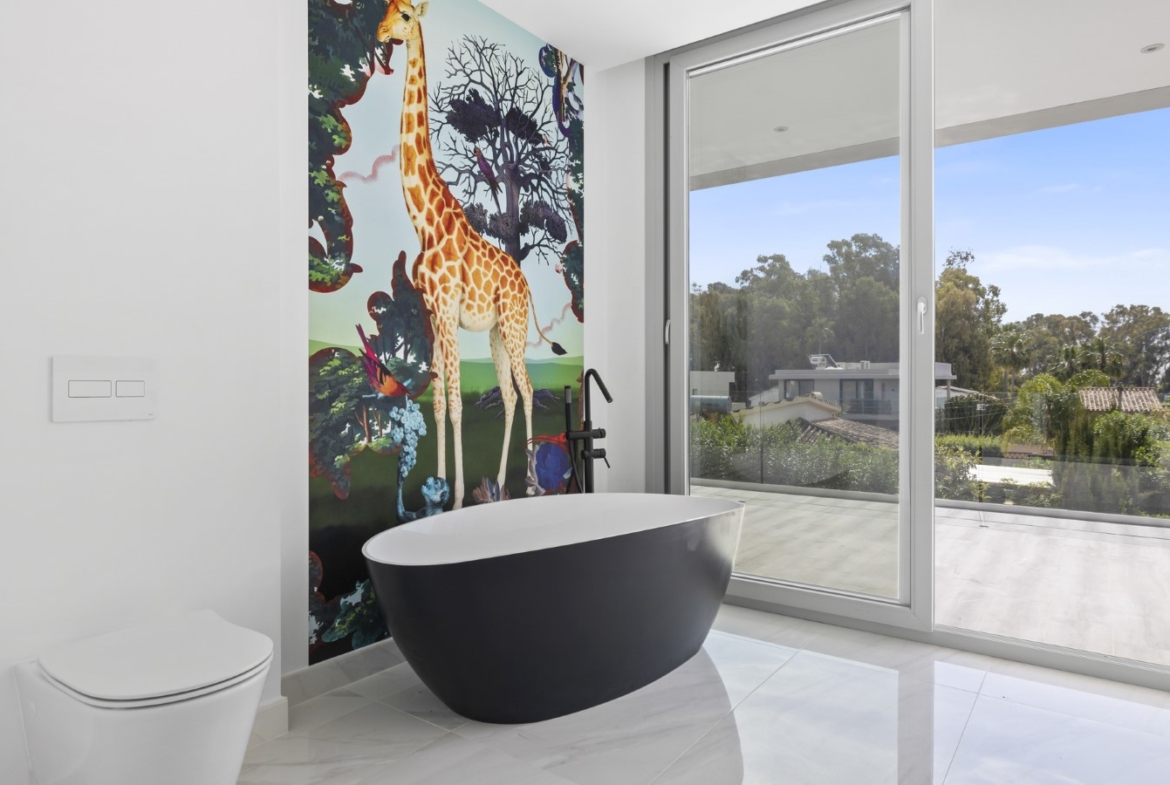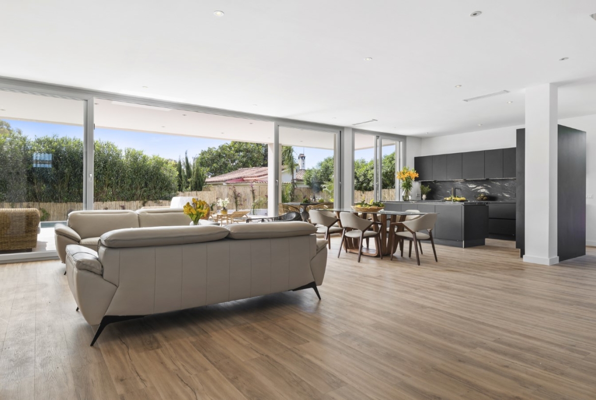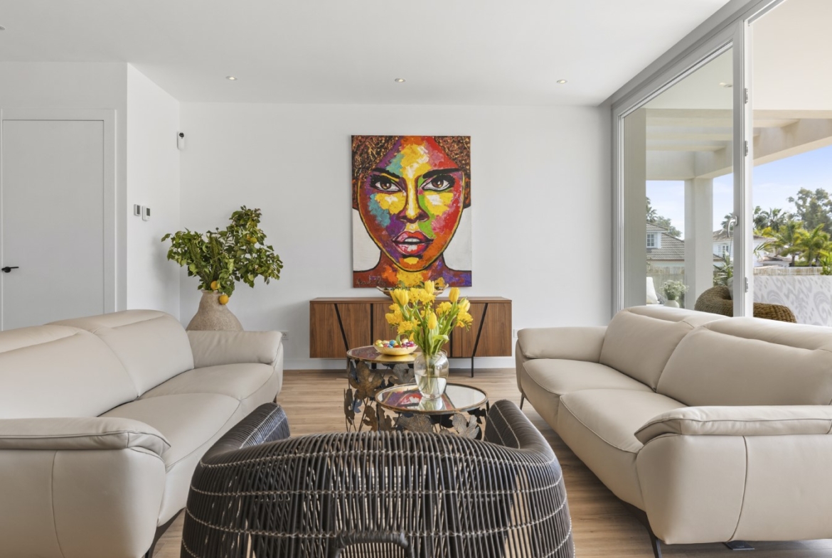 Newly built quality villa on the beach side of San Pedro de Alcántara. Build to the highest German qualities. Walking distance to the beach and the paseo of San Pedro.Main floor: Entrance, living and dining area with an fully open plan kitchen with Bosch appliances, guest toilet, one guest bedroom en suite. Access from all areas to the covered and open terraces and the private pool. First floor: Master bedroom en suite with dressing area and one guest bedroom en suite. Private terraces. Lower floor: A separate apartments with another fully fitted kitchen, one guest bedroom en suite and an entertainment area or gym. Inside parking for two cars. The furniture could be negotiated.A unique location !