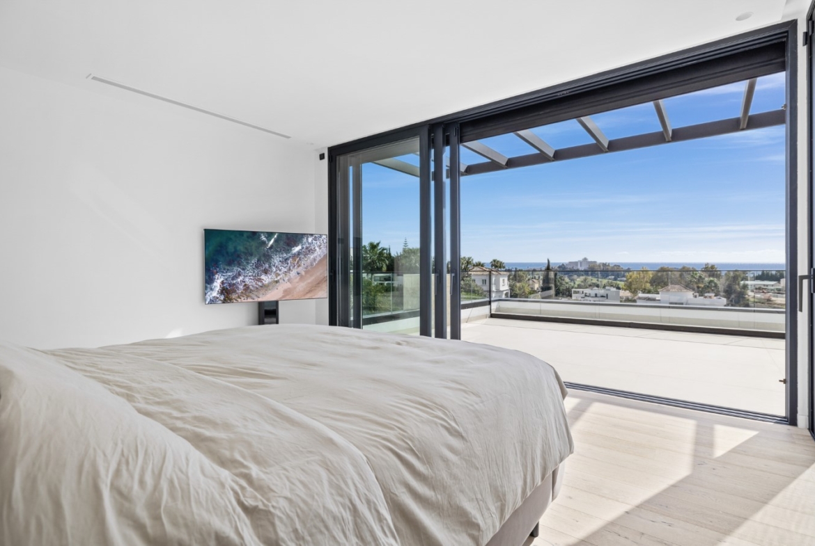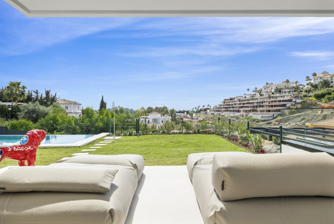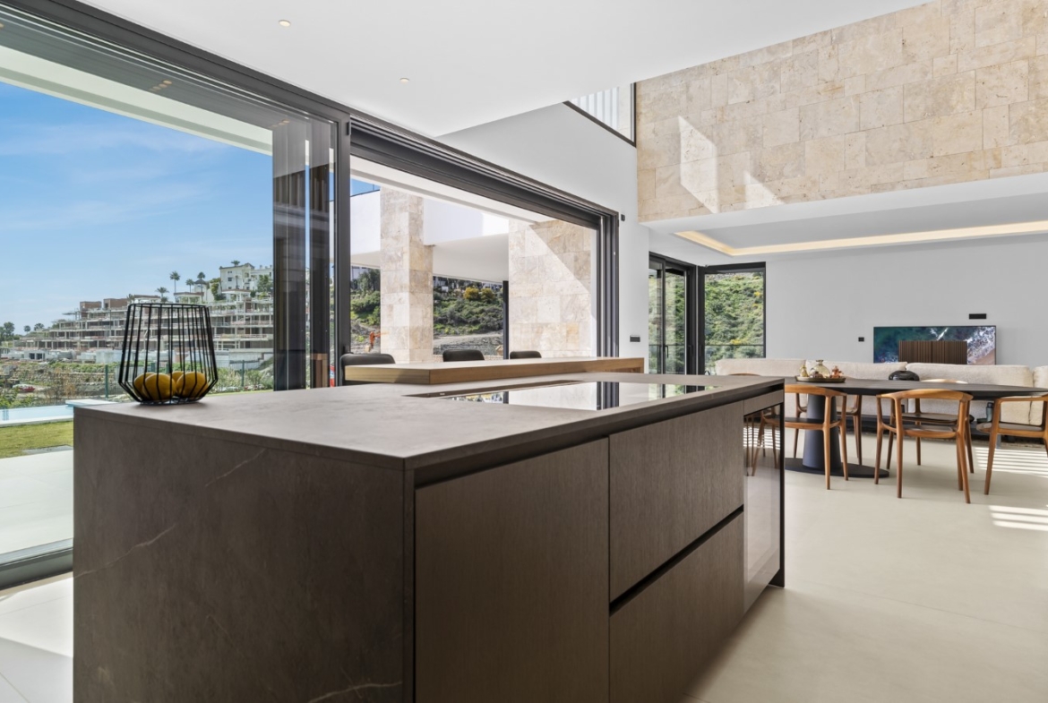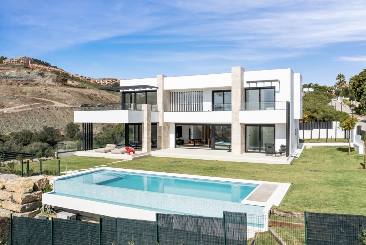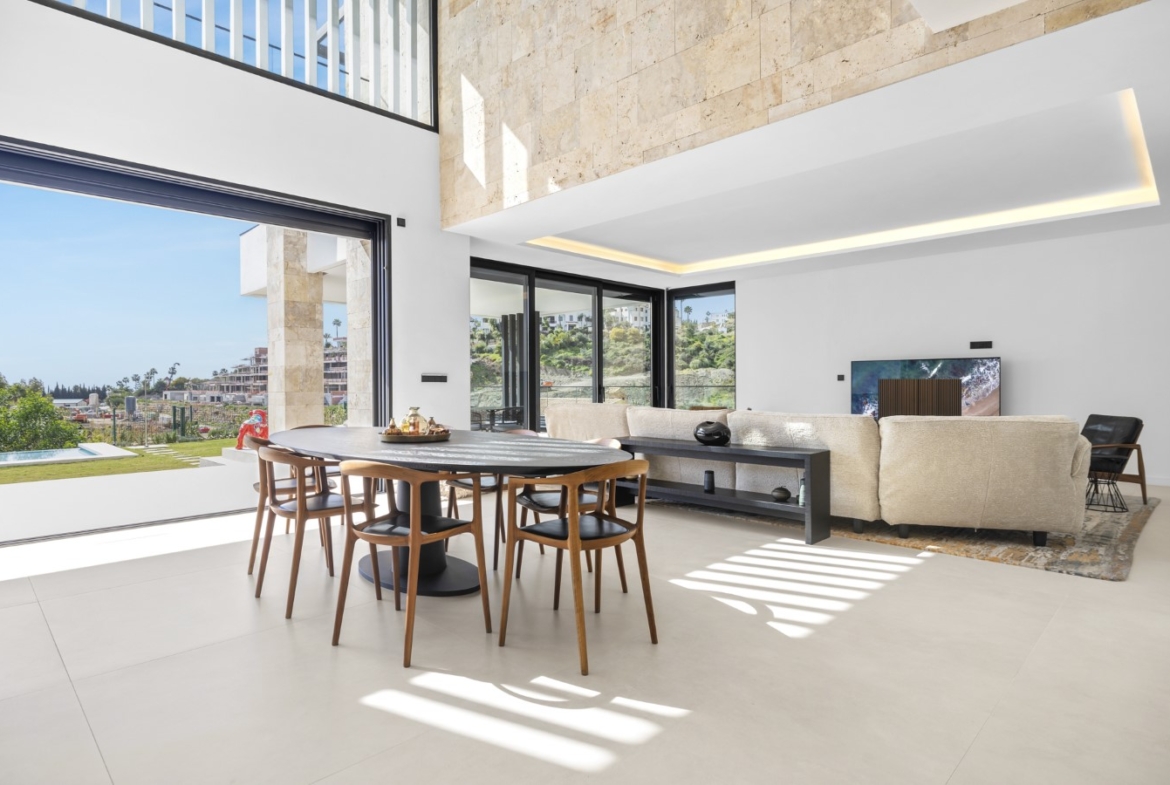 A top quality, new built contemporary villa (2024), located in the sought after residential area of La Alqueria, Benahavís. South to west facing with views to mountains and some sea views from the upper floor. Private and quiet. Near all amenities, 10 minutes drive to the beach and the town center of San Pedro. Main floor: Entrance hallway, large living and dining area with high ceilings, and an open plan fully fitted kitchen from Modul Nova with Miele appliances. Separate laundry room, guest toilet and one guest bedroom ensuite. Direct access from the living areas to the covered and open terraces and into the garden and private pool.