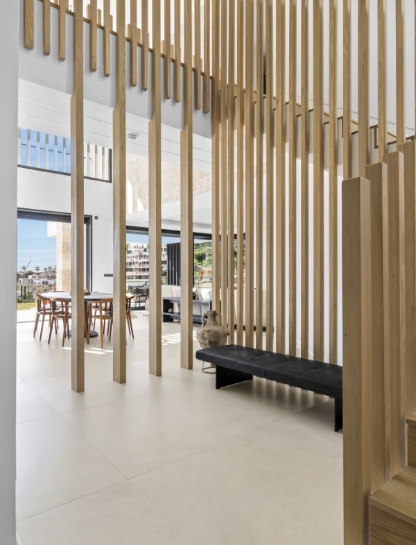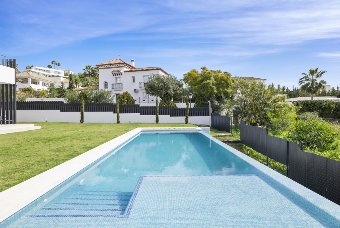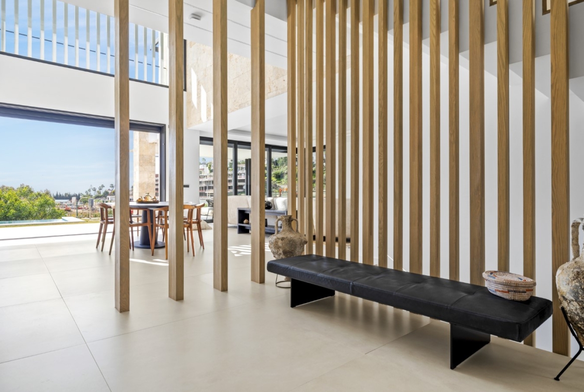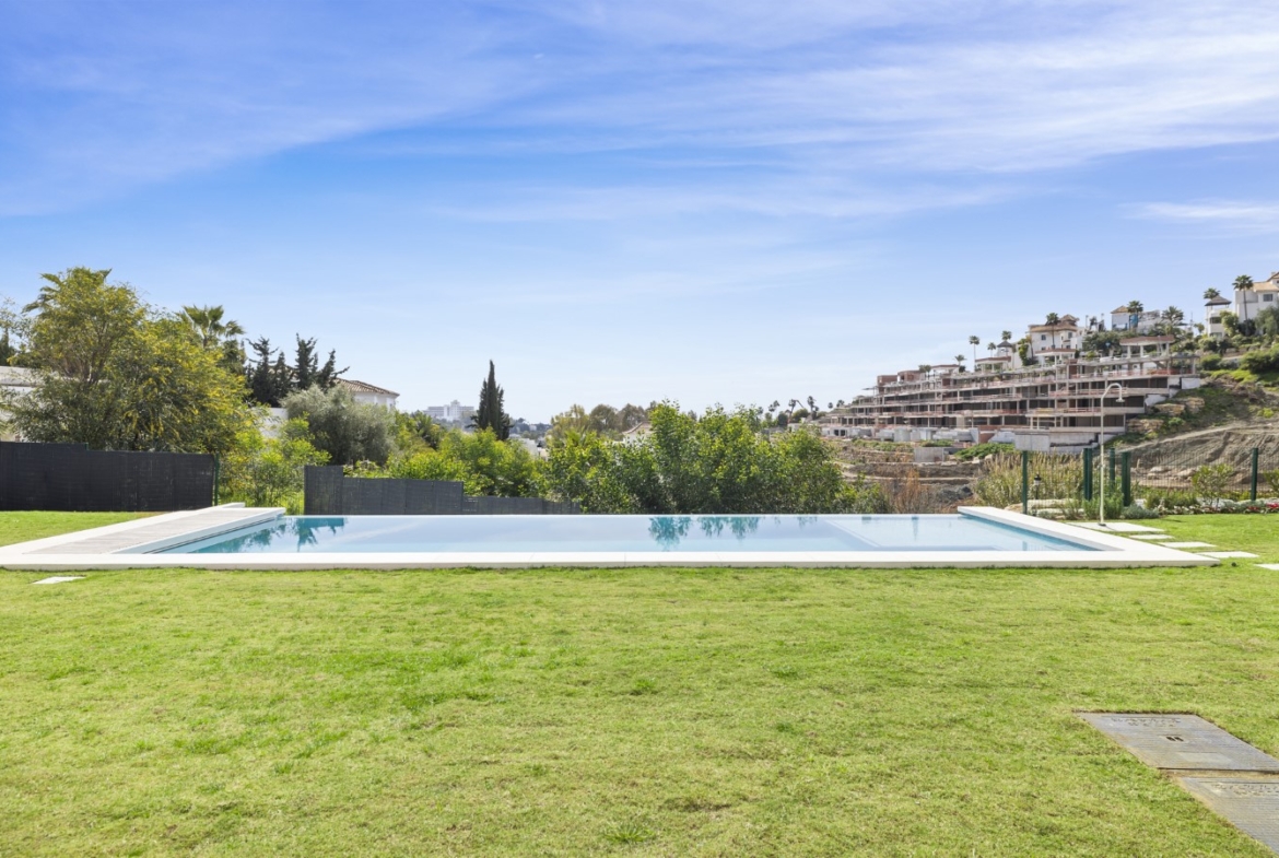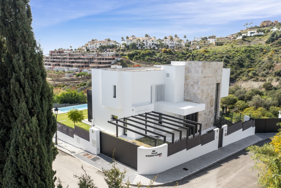 A top quality, new built contemporary villa (2024), located in the sought after residential area of La Alqueria, Benahavís. South to west facing with views to mountains and some sea views from the upper floor. Private and quiet. Near all amenities, 10 minutes drive to the beach and the town center of San Pedro. Main floor: Entrance hallway, large living and dining area with high ceilings, and an open plan fully fitted kitchen from Modul Nova with Miele appliances. Separate laundry room, guest toilet and one guest bedroom ensuite. Direct access from the living areas to the covered and open terraces and into the garden and private pool.