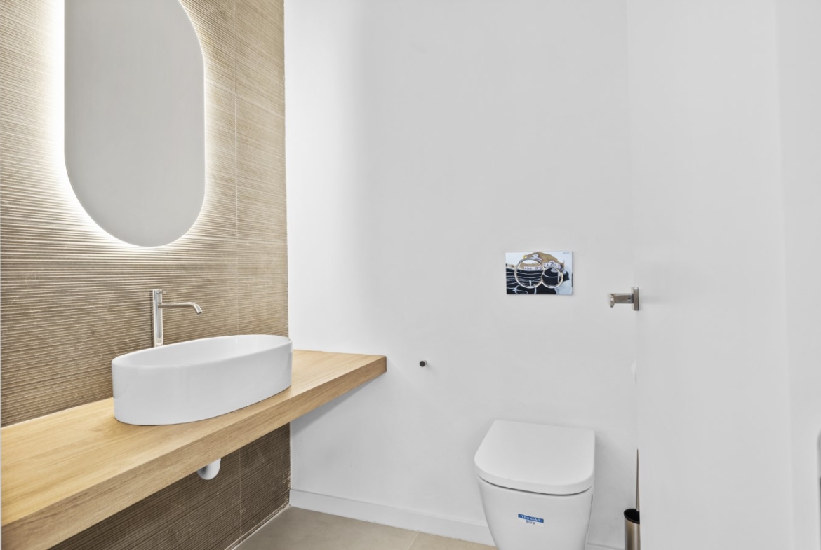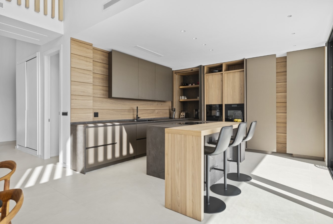 Upper floor: Master bedroom ensuite with dressing area and two more guest bedrooms ensuite. Access to terraces with a bit of seaviews. Lower floor: Big polyvalent room, another guest toilet, storage space and garage for two cars. Private garden and a heated pool with salted water. Next to the garage is a covered carport for 2 cars. Build to the highest qualities, with an A energy certificate. Airzone A/C with heating, under floor heating throughout, 20 solar panels, elevator to all 3 floors, electric charger in the garage. The furniture is not included but negotiable.