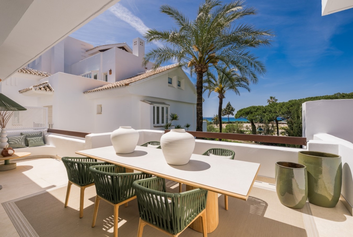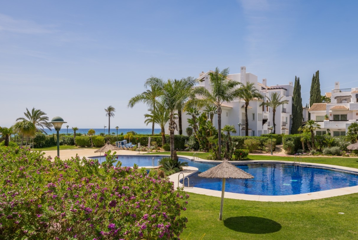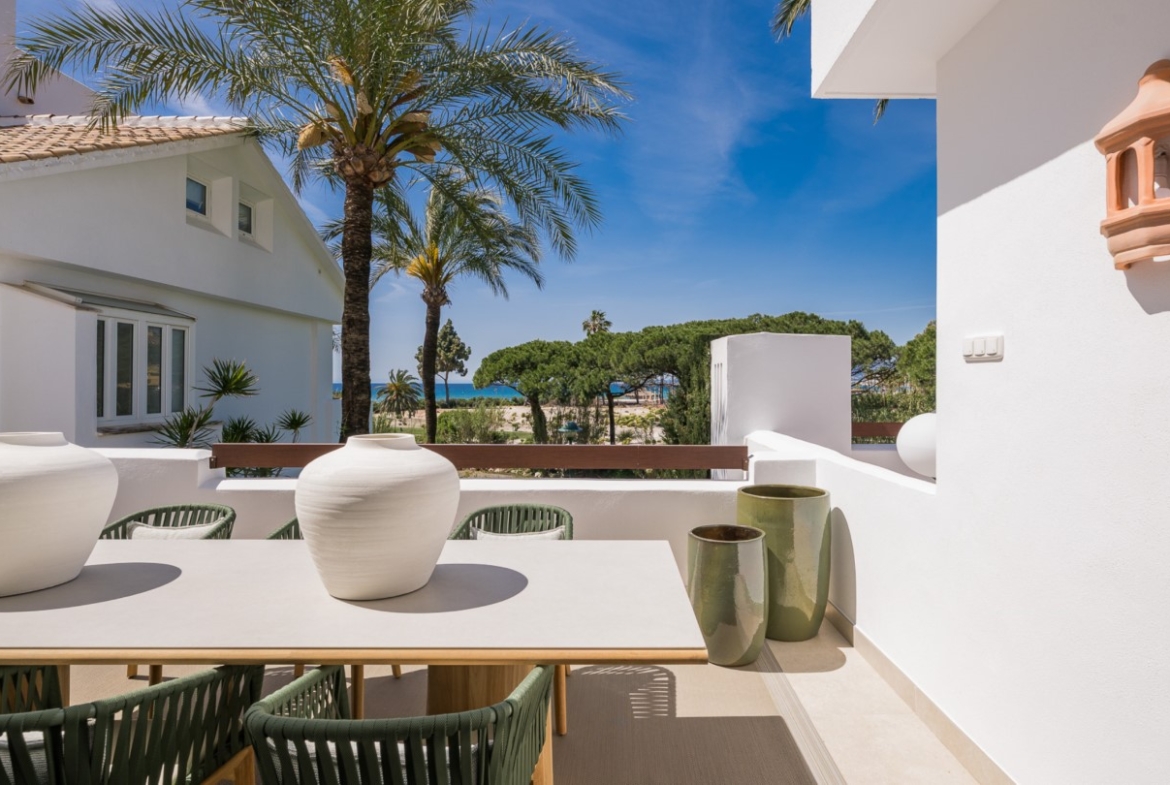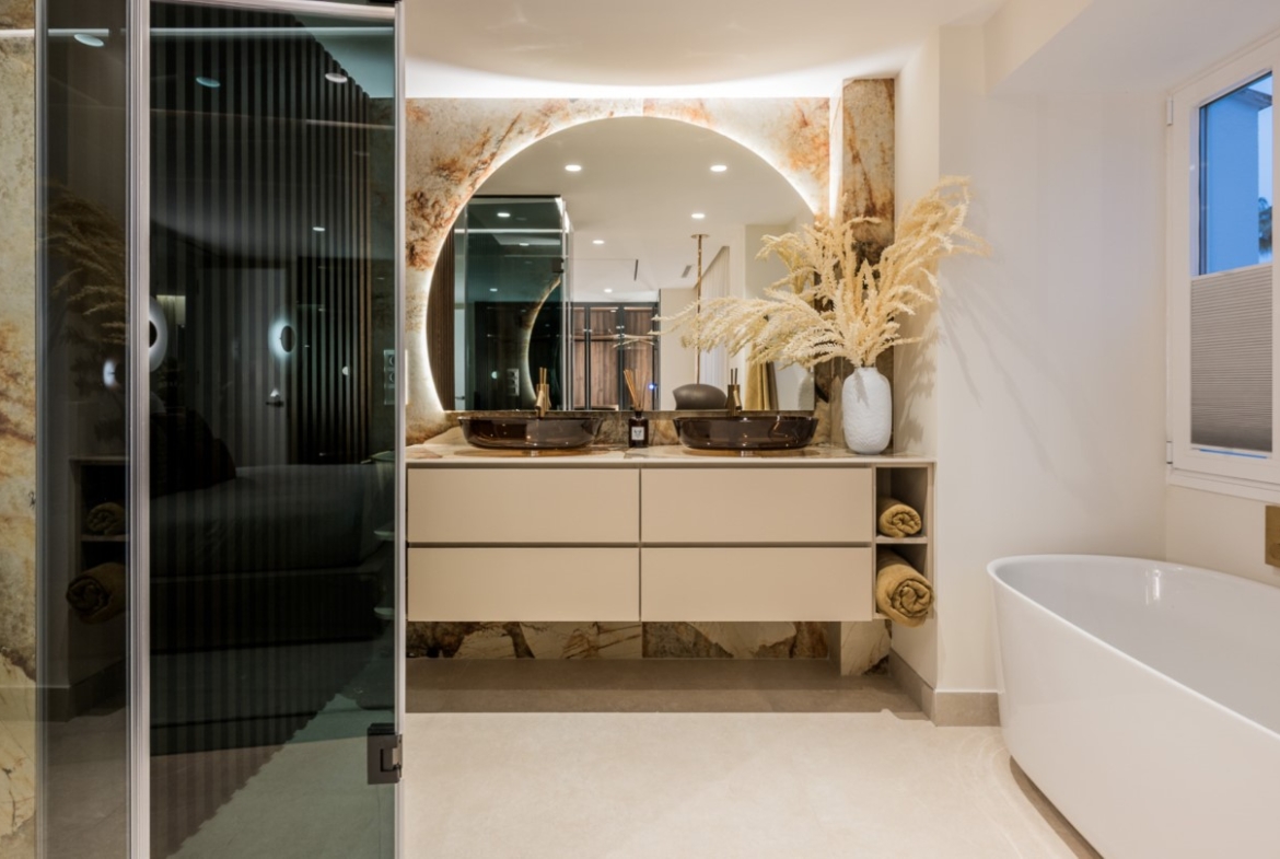 Palm Beach is a secure, gated community located on Marbella’s eastern coast, just a 5-minute drive from city centre. Newly renovated 3 bedroom, 2 bathroom apartment combines luxury and comfort with a quiet and private location. Facing southwest, offers panoramic views of lush subtropical gardens and the Mediterranean Sea. This apartment also includes a storage room and a private parking space in the communal garage. Every aspect of the apartment has been meticulously crafted, from the state-of-the-art Bang & Olufsen sound system and electric fireplace in the living room to the custom-built wardrobes and indulgent freestanding bathtub.