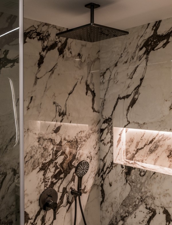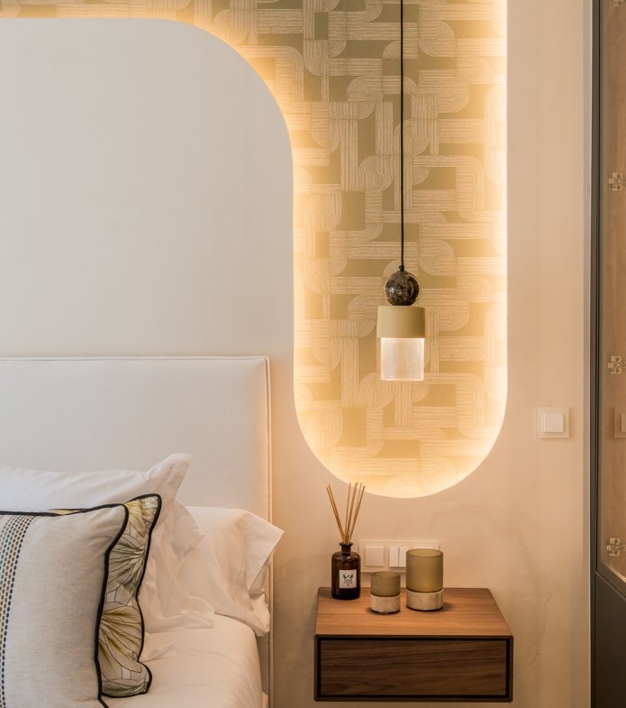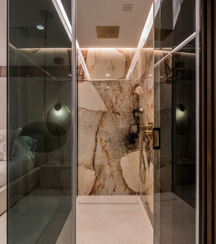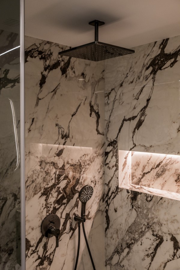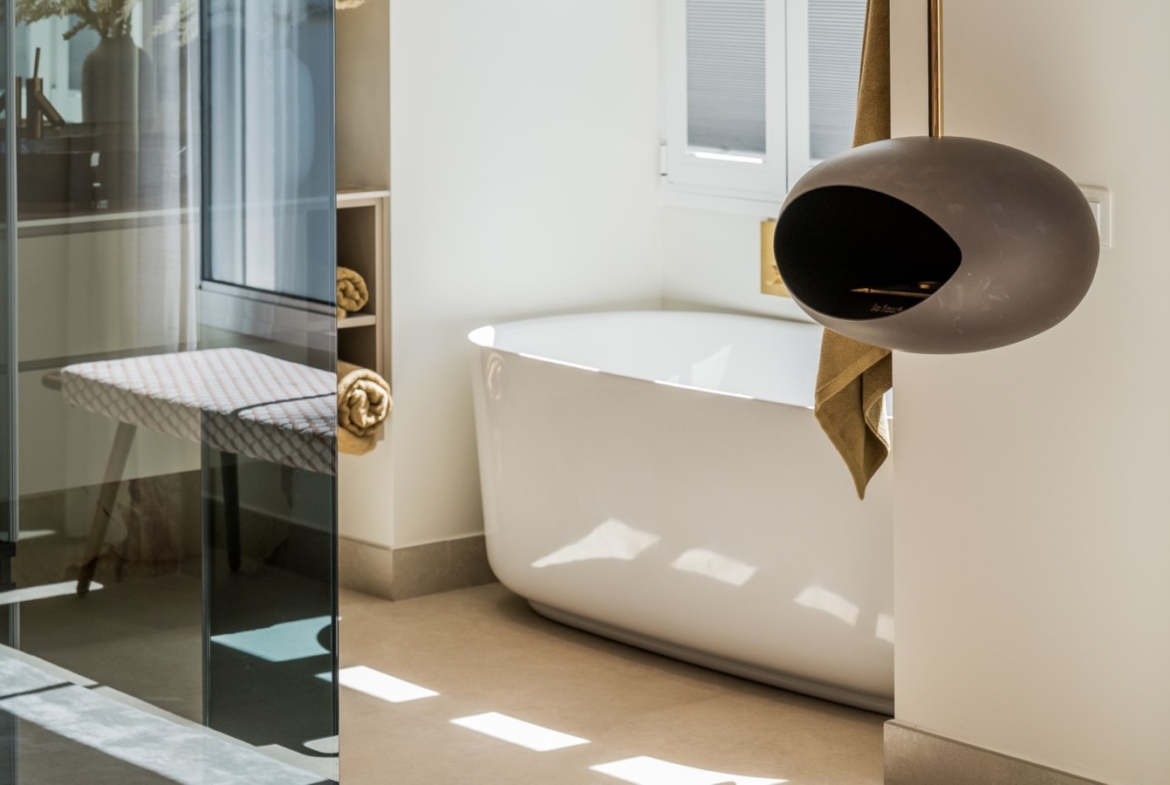 The master bedroom features an invisible ceiling TV and a cozy bioethanol fireplace for ultimate relaxation. It leads to a stunning en-suite bathroom with a freestanding bathtub, offering a perfect space to unwind in privacy and comfort.