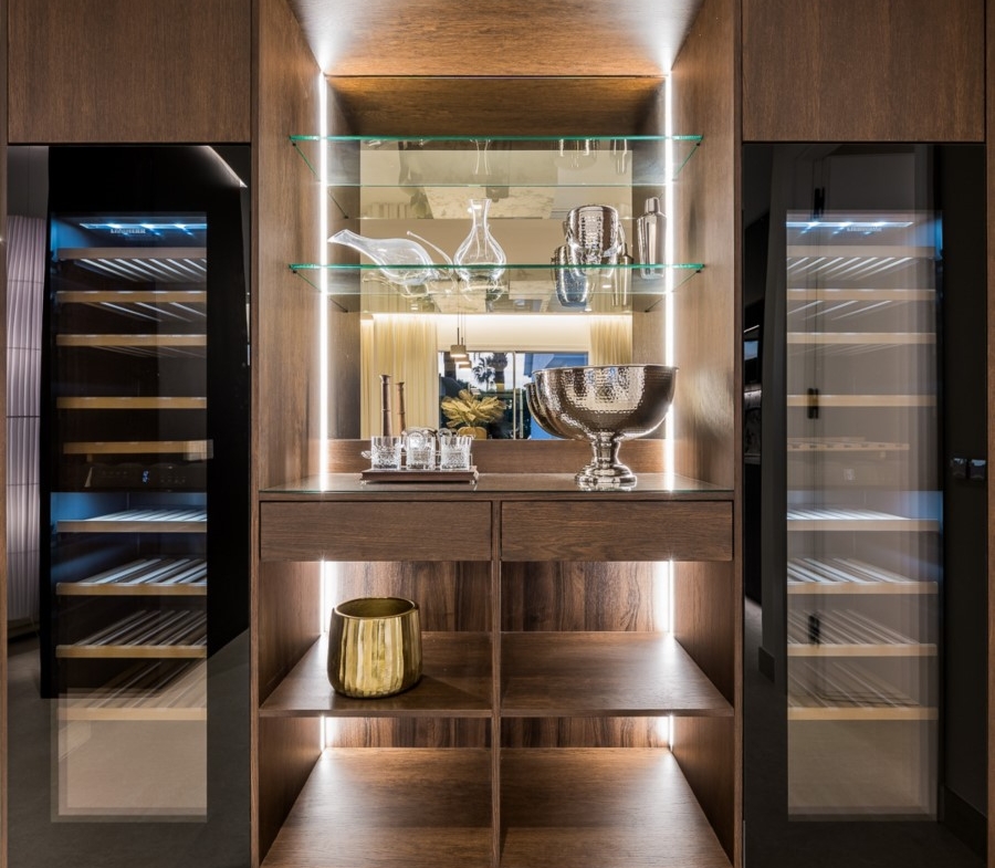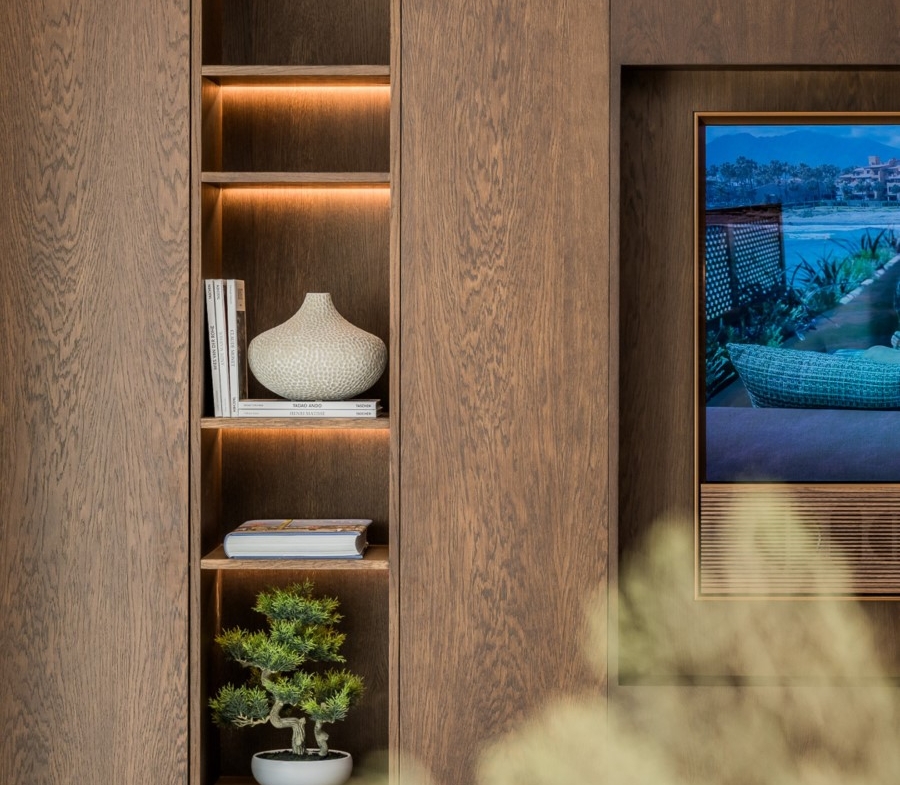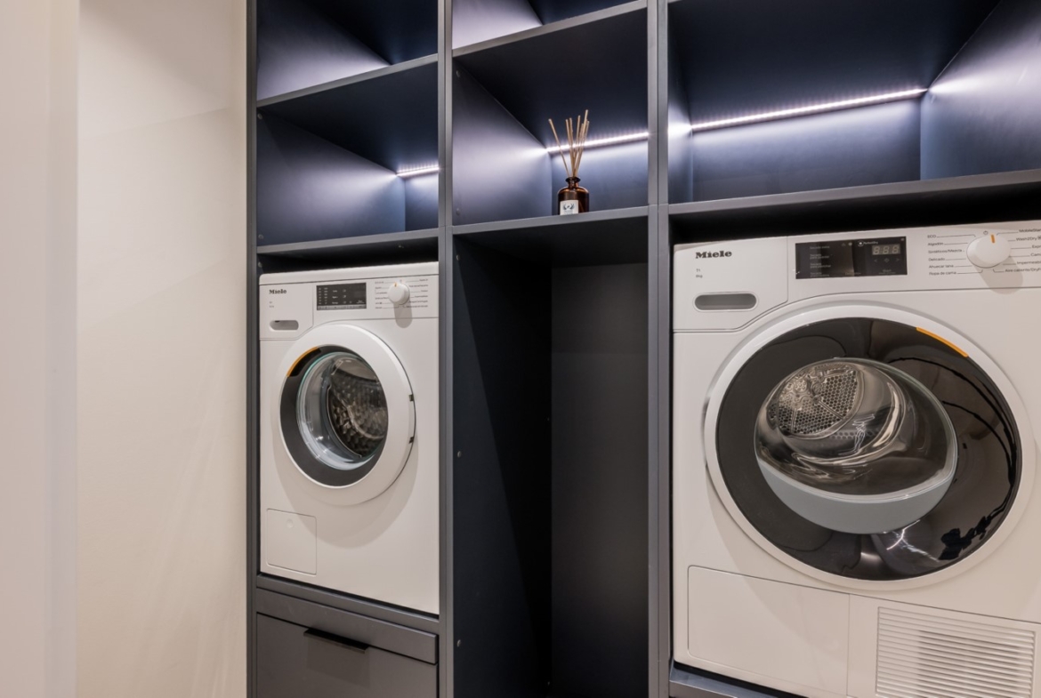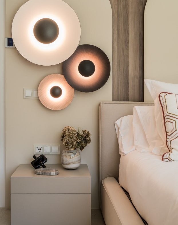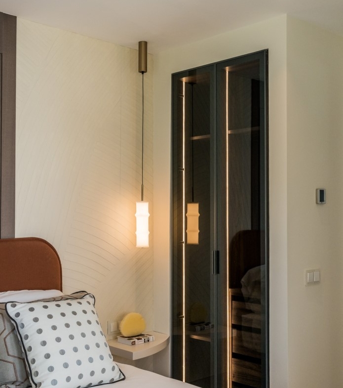 The master bedroom features an invisible ceiling TV and a cozy bioethanol fireplace for ultimate relaxation. It leads to a stunning en-suite bathroom with a freestanding bathtub, offering a perfect space to unwind in privacy and comfort.