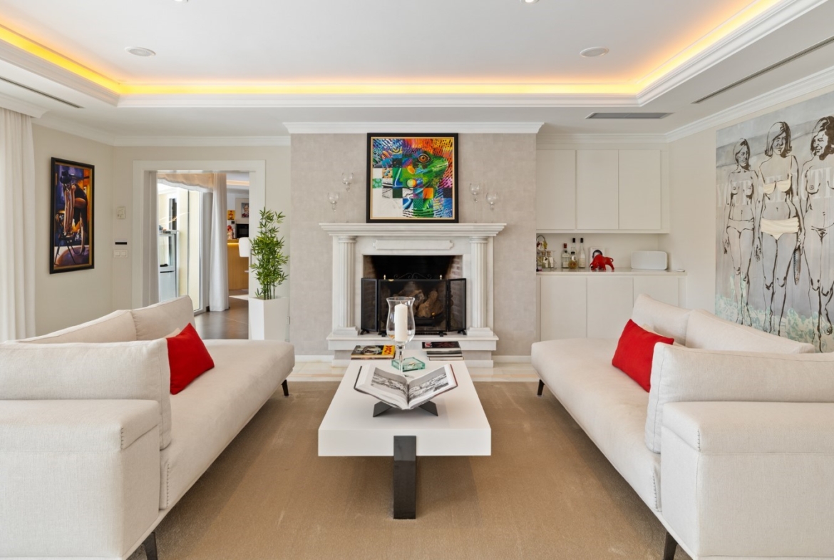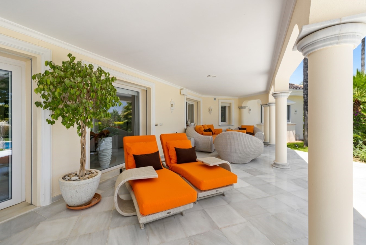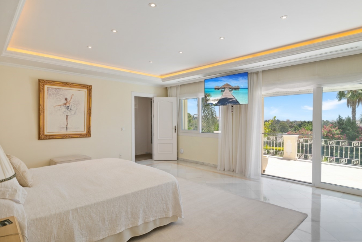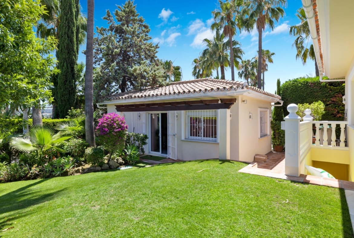 A great, recently renovated villa with a perfect fusion between contemporary design and Andalusian style. Located in the sought after residential area of La Cerquilla. South facing with views to La Concha. Private and quiet. Nearby all amenities and the golf clubs of Las Brisas and Los Naranjos. Main floor: Entrance hallway, large living area with fireplance and high ceilings, dining area with an open plan fully fitted kitchen with Siemens and Neff appliances and a entertainment bar area. Four guest bedrooms ensuite, office, guest toilet, laundry area. Access to the covered and open terraces from the living areas into the garden and pool area. First floor: Master bedroom ensuite with dressing area with direct access to the terrace. Lower floor: Entertainment area, bodega, cinema room, gym, garage for 6 cars and storage. Separate fully fitted guest or staff apartment. Beautiful mature gardens, outdoor chill area with BBQ and a nice sized heated pool. The furniture is negotiable. A great home, one to see !