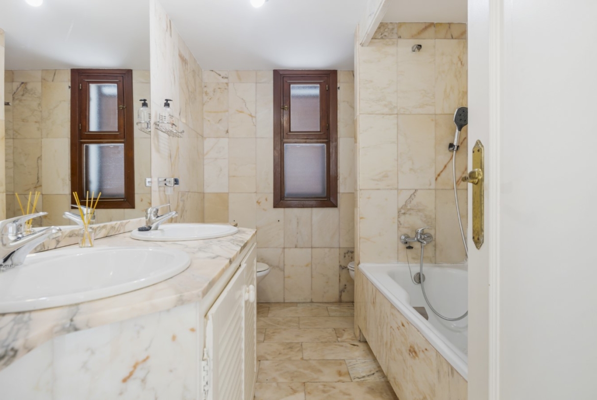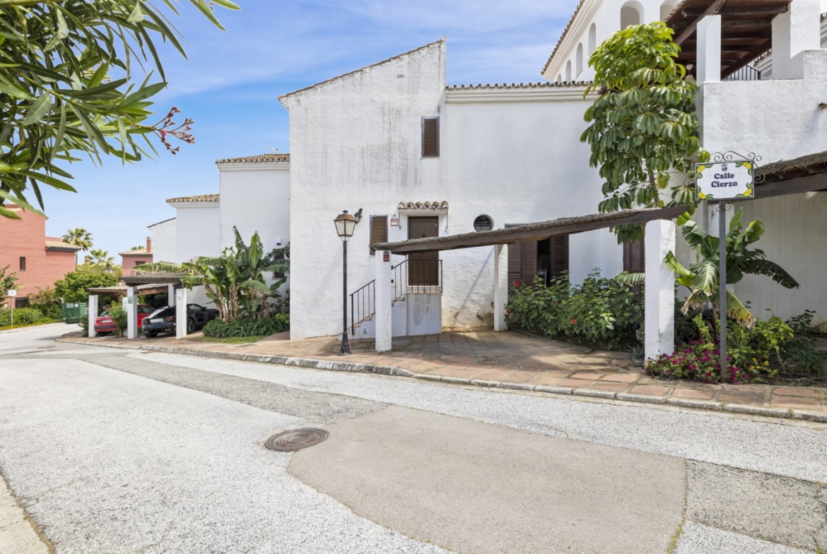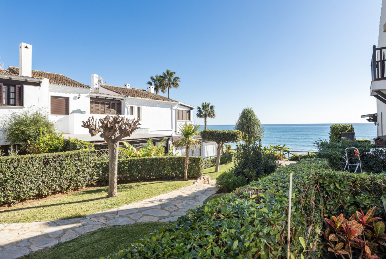 Located in the sought-after frontline beach development of Bahía Azul in Estepona West, this 2-bedroom townhouse offers an excellent opportunity to renovate and personalise a home in a prime coastal setting. The ground floor features a bright living and dining area, a kitchen space, guest toilet, and access to a covered terrace. On the upper level, there are two bedrooms sharing a bathroom, along with a second terrace enclosed with glass curtains, offering partial sea views. The gated community boasts beautifully maintained mature gardens and two communal swimming pools. Its exceptional location is within walking distance to the marina of Estepona, the town centre, and the popular Playa del Cristo beach. The property requires refurbishment, making it an ideal project for those looking to create a comfortable residence or holiday home by the sea.