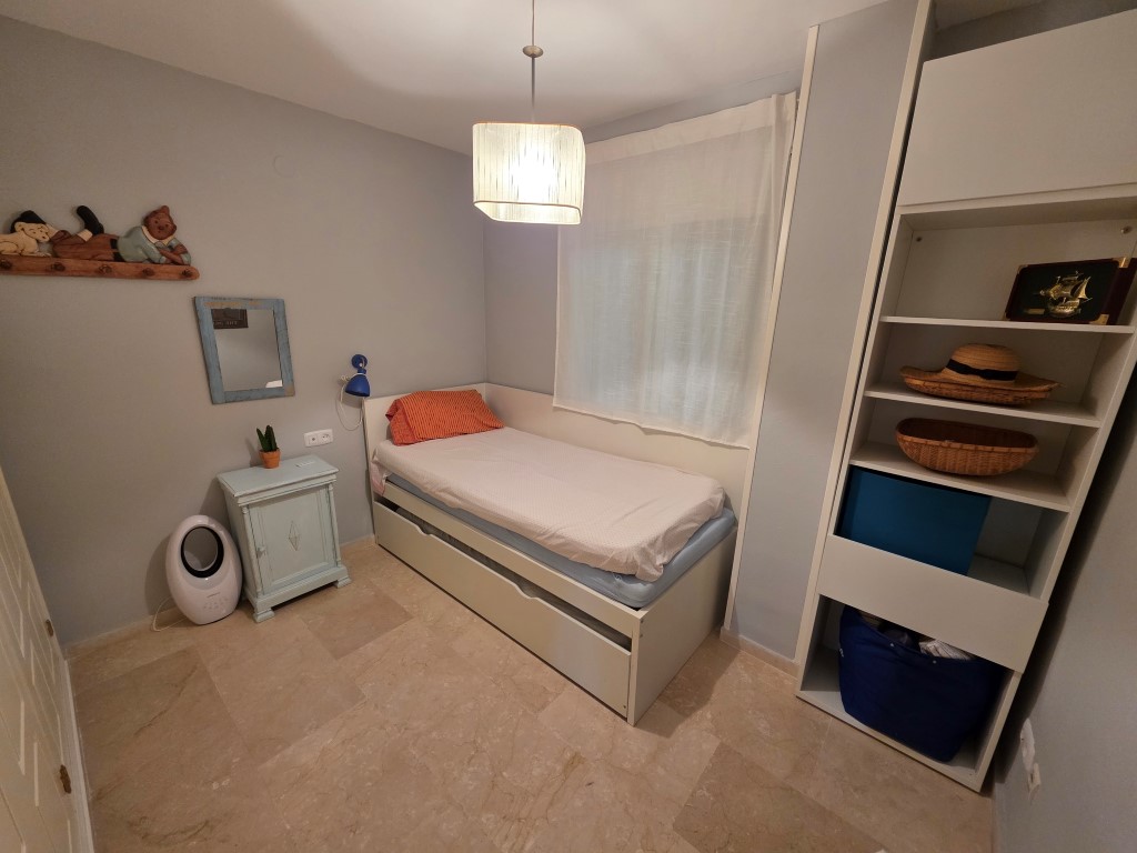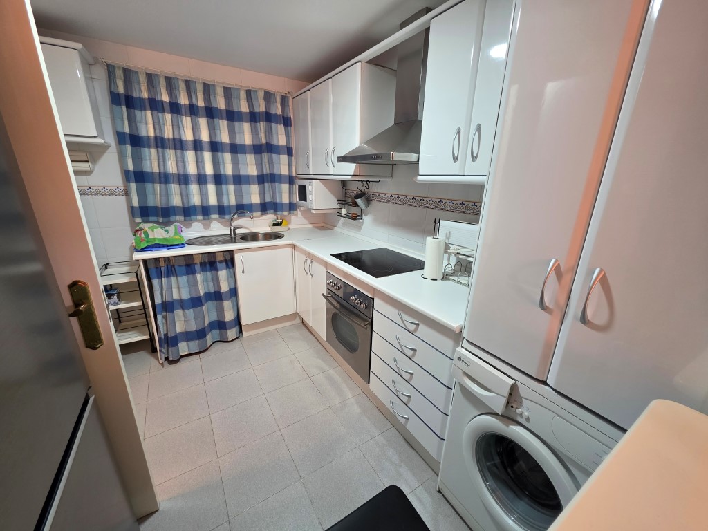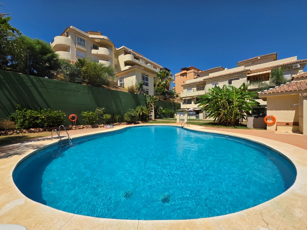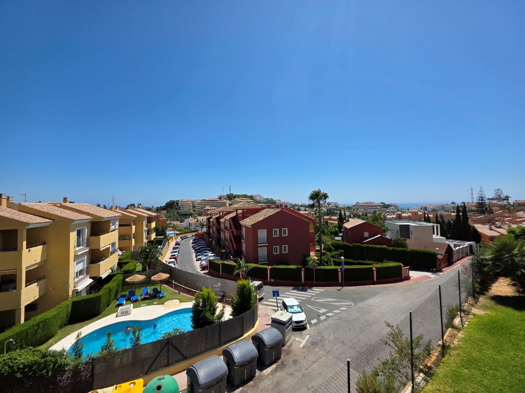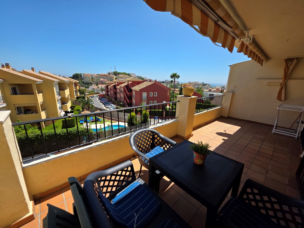 Apartment with two bedrooms, one bathroom, a fully equipped kitchen, a large living area with access to a terrace facing west, for sale in Riviera del Sol, Mijas Costa. This apartment is located in an urbanization offering garden and pool areas. Included into the price is a private parking! From the large terrace you enjoy the morning sun and panoramic views. Within 30-40 minutes to the Malaga airport and city and just 20 minutes from Marbella city center.