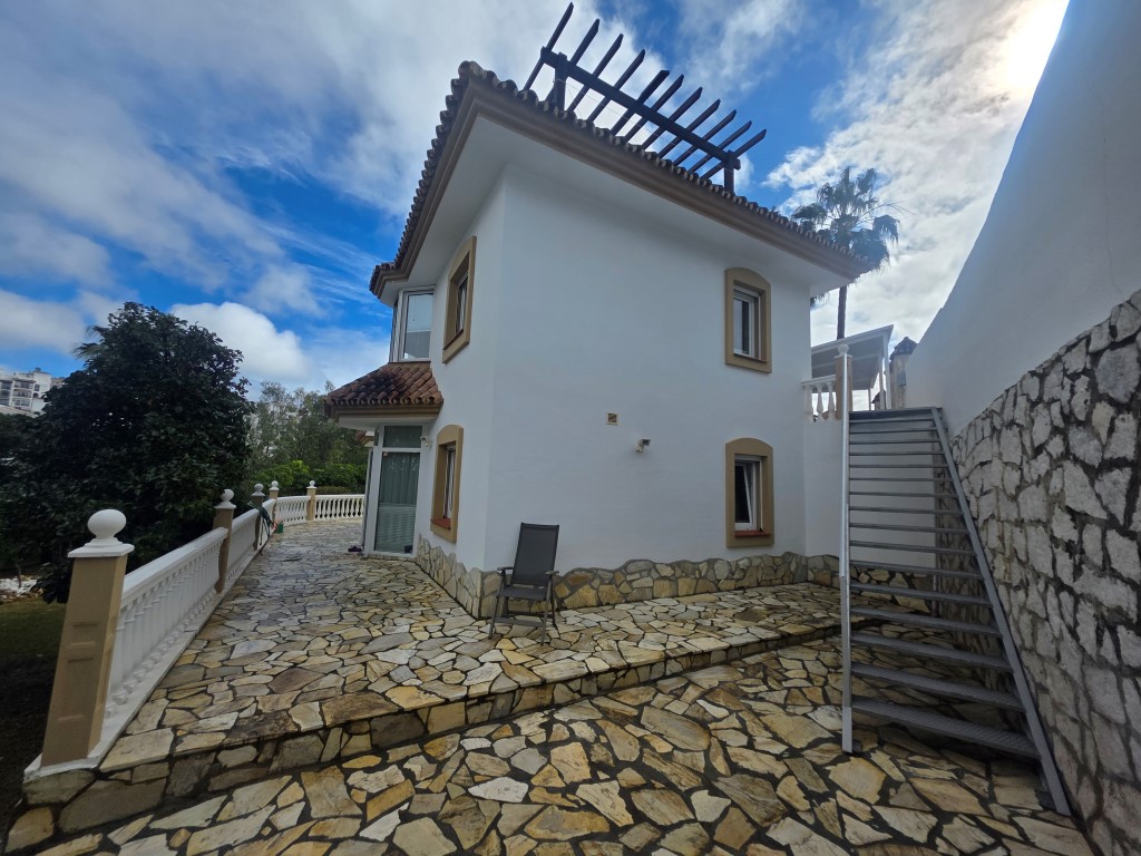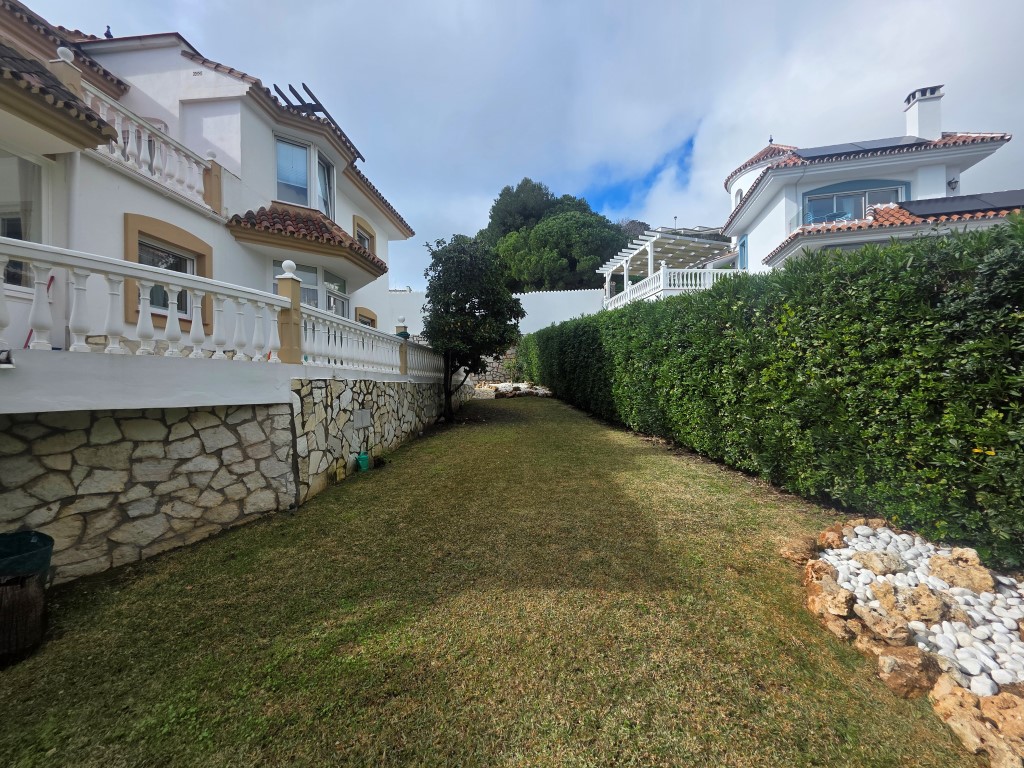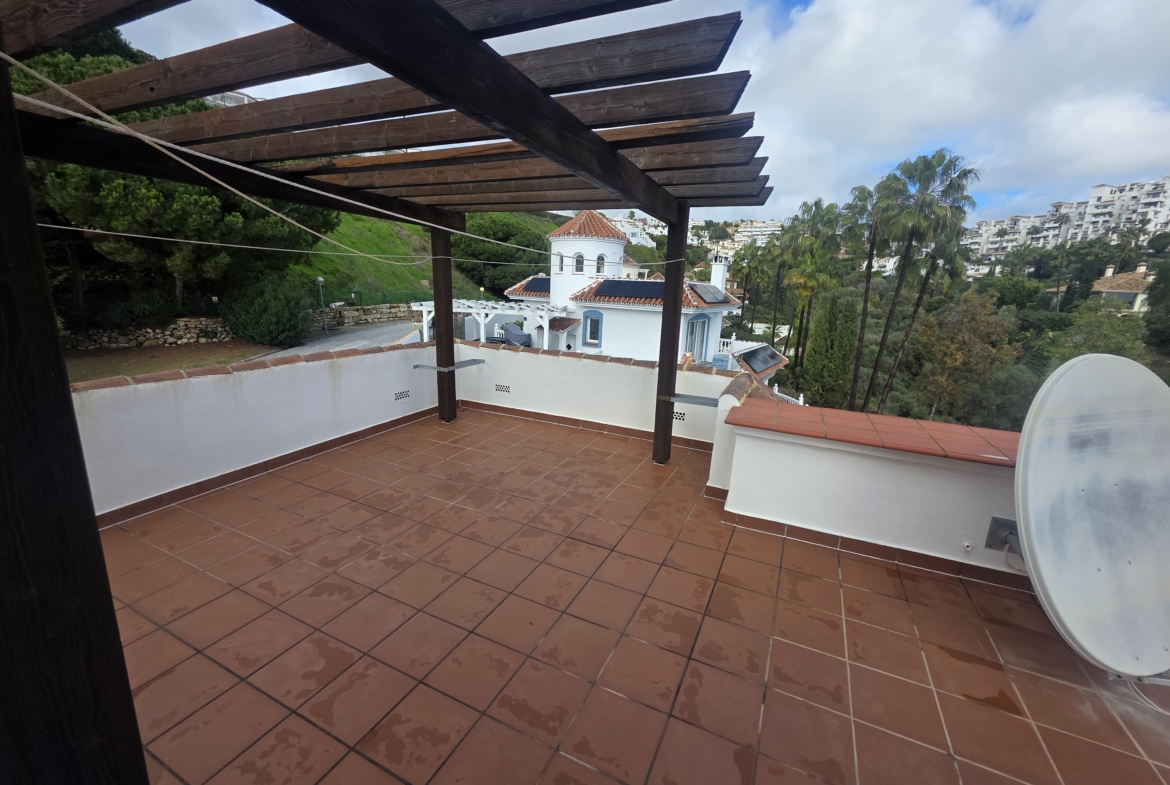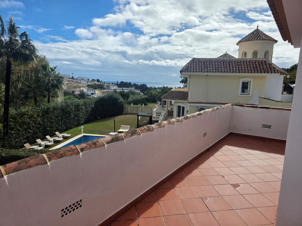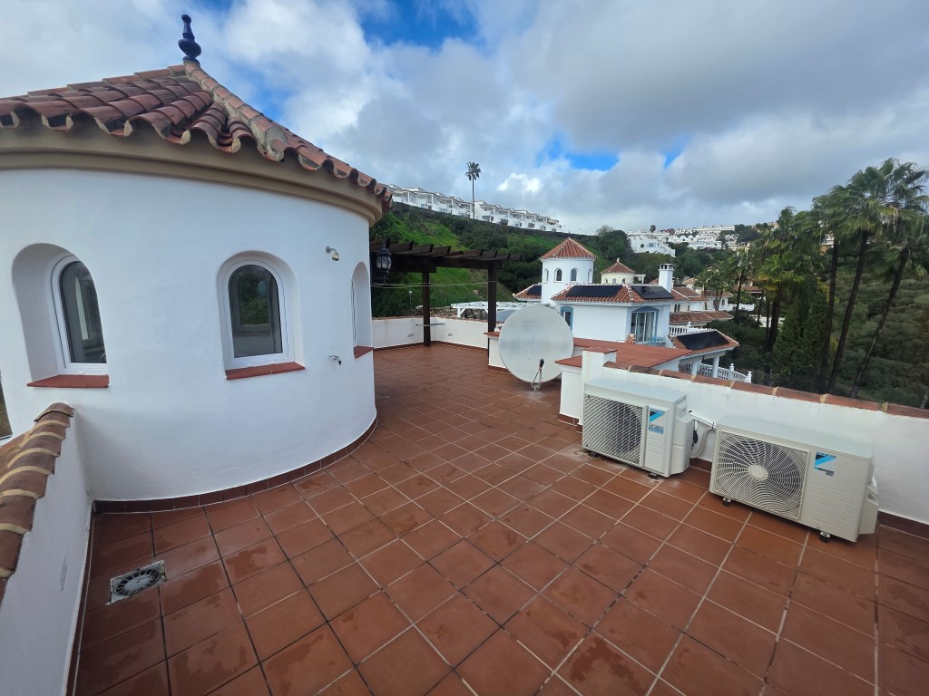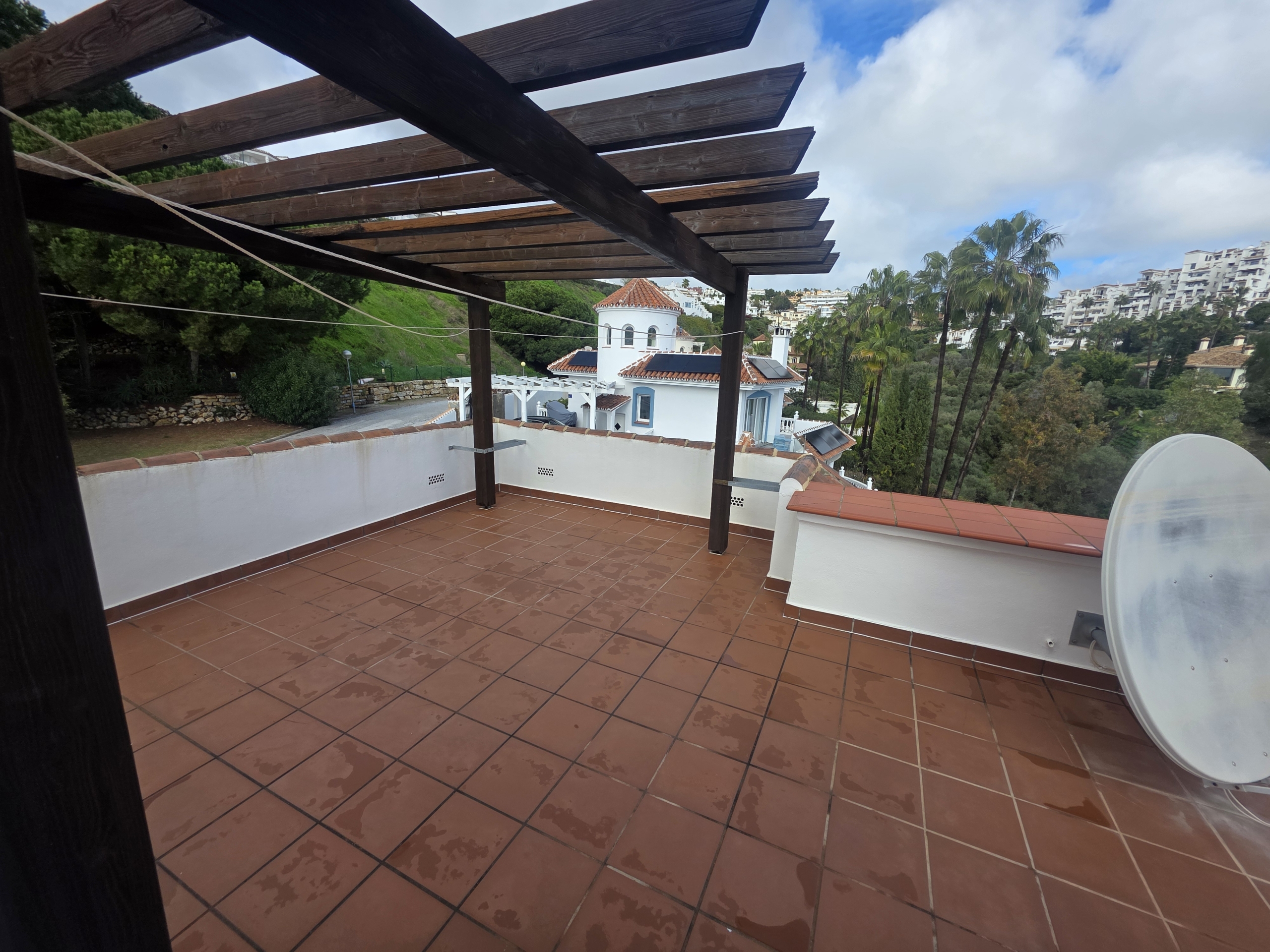 Villa with private garden and pool for sale in Calahonda, Mijas Costa! This unique villa is facing south east and is in excellent condition, built in the year 2000 with high quality materials. Some highlights are double glazed windows, a security system, a large glazed terrace with seaviews, central heating, a roof top terrace, a private parking space, a basement, a private pool and a large garden. Close to Marbella and Malaga Airport and city. Currently the villa offers on the ground floor level a large open kitchen with access to the living and dining room, a storage and a full bathroom. Access to the large terrace from the living room with good views down the green valley and to the sea. On the upper level you find two bedrooms (1 Ensuite and with access to a large terrace) and two bathrooms. All the way on top there is a roof top terrace again with great views. Possibility to built up to a total of three of four bedrooms due to the large basement space.