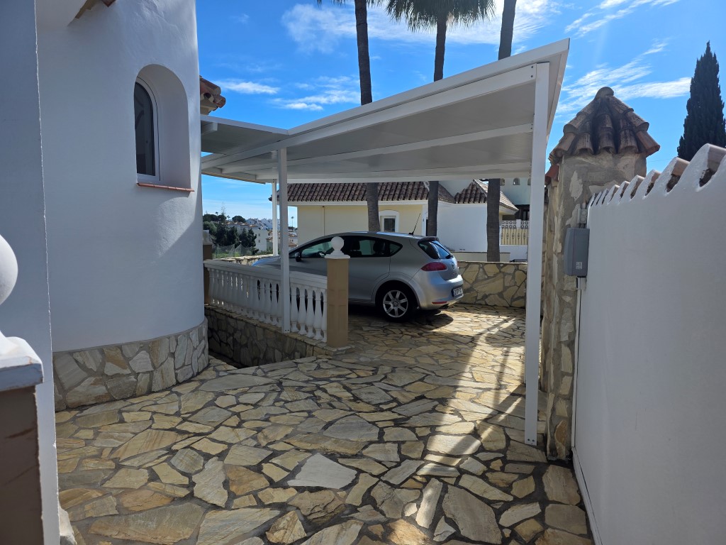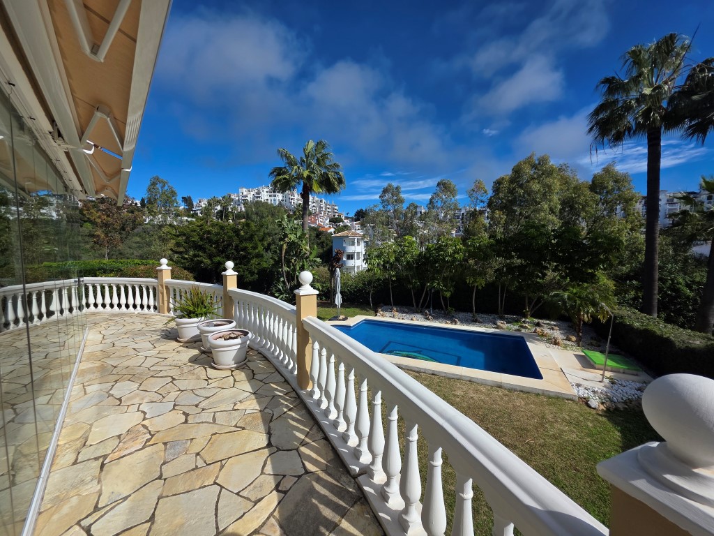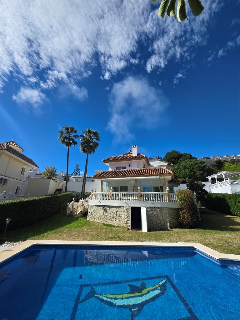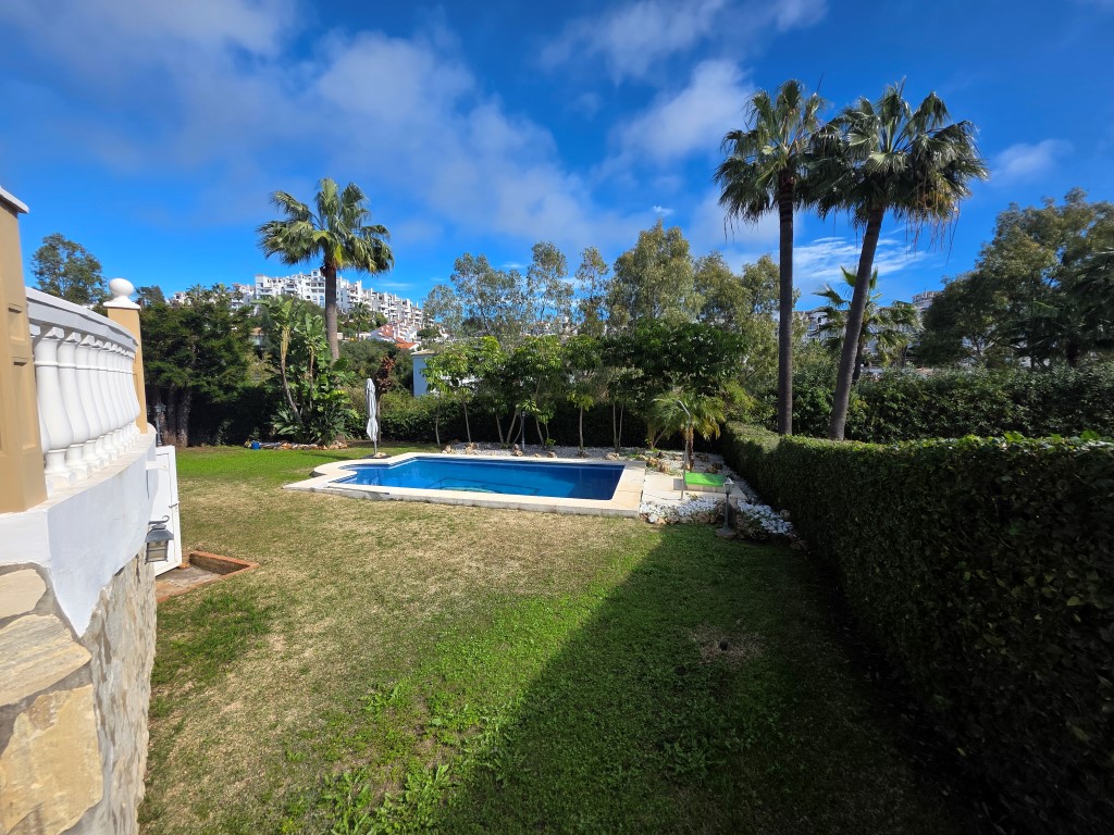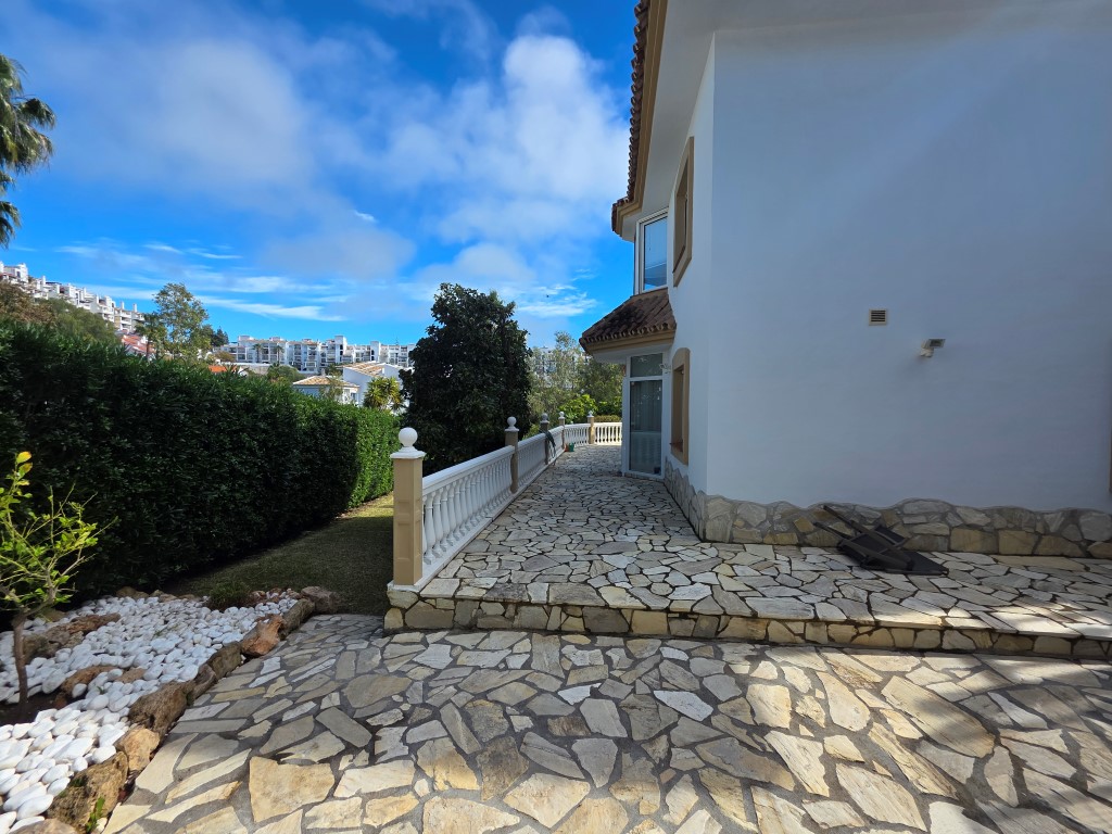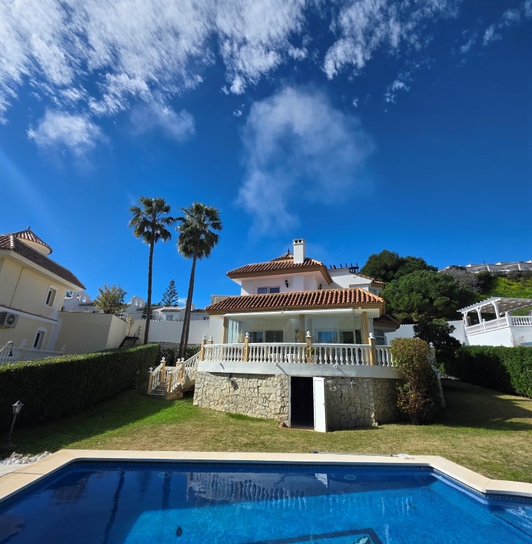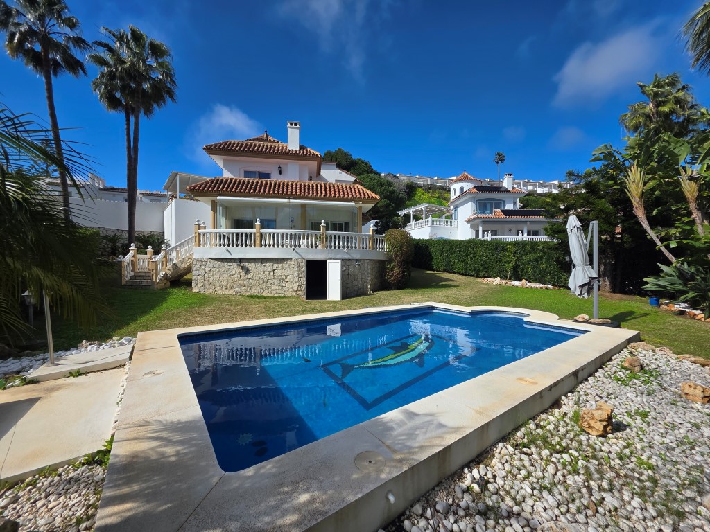 Villa with private garden and pool for sale in Calahonda, Mijas Costa! This unique villa is facing south east and is in excellent condition, built in the year 2000 with high quality materials. Some highlights are double glazed windows, a security system, a large glazed terrace with seaviews, central heating, a roof top terrace, a private parking space, a basement, a private pool and a large garden. Close to Marbella and Malaga Airport and city. Currently the villa offers on the ground floor level a large open kitchen with access to the living and dining room, a storage and a full bathroom. Access to the large terrace from the living room with good views down the green valley and to the sea. On the upper level you find two bedrooms (1 Ensuite and with access to a large terrace) and two bathrooms. All the way on top there is a roof top terrace again with great views. Possibility to built up to a total of three of four bedrooms due to the large basement space.